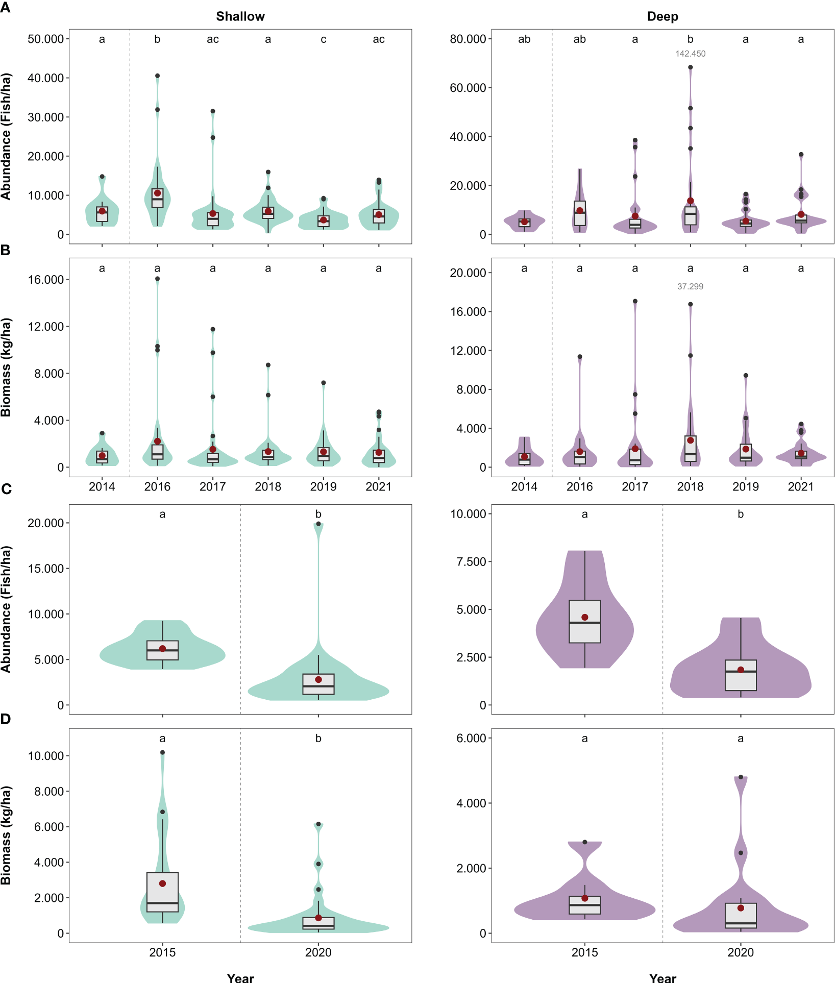 Overall fish abundance and biomass in kg per hectare obtained from (A, B) indicator and (C, D) extended surveys displayed as median and interquartile range (outliers: small black dots; means: larger red dots) at shallow (2–5 m depth) and deep (15 m depth) water depths at Aldabra. Shaded areas (violin plots) show kernel density estimation and represent data distribution. Letters above boxplots indicate significant differences (p < 0.05) between years (Tables S7, S8). For improved readability, very large outliers were not plotted and are shown in grey font for the respective year. Dashed line indicates the bleaching event.
