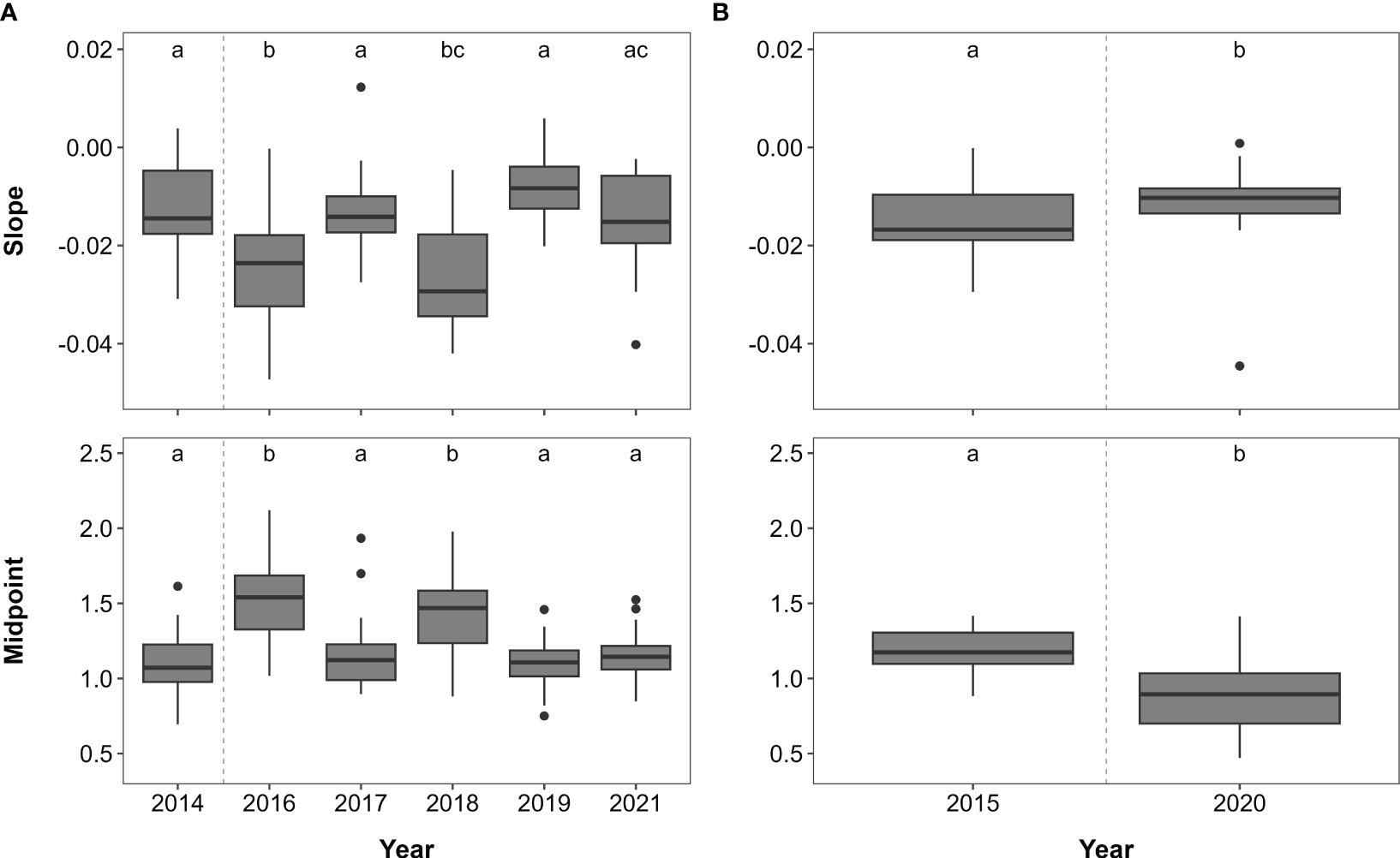 Slope and midpoint of size spectra of the fish assemblages per year obtained from (A) indicator and (B) extended surveys displayed as median and interquartile range (outliers: small black dots). Letters indicate significant differences (p < 0.05) between years.