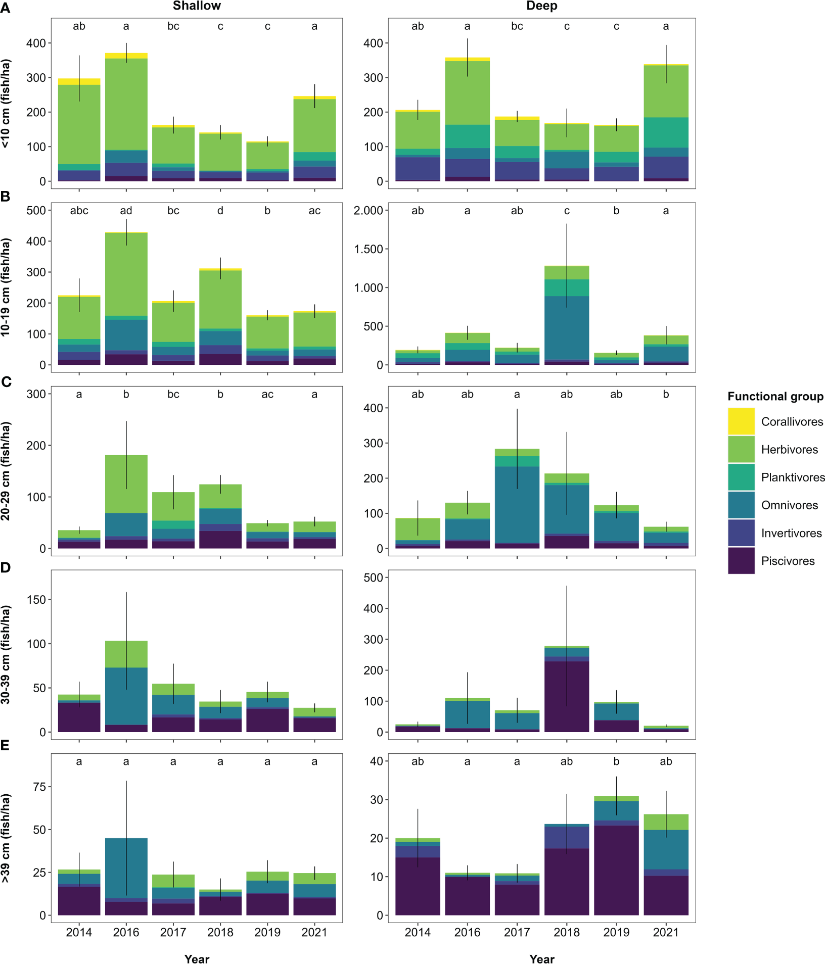 Fish abundance per size class (A-E) per year obtained from indicator surveys. Values represent mean abundance for each size class with error bars indicating standard error. The proportional contribution of functional groups to each size class per year is shown in coloured shades. Note the different y-axis scaling. Letters indicate significant differences (p < 0.05) between years for overall abundance per size class (Table S10).