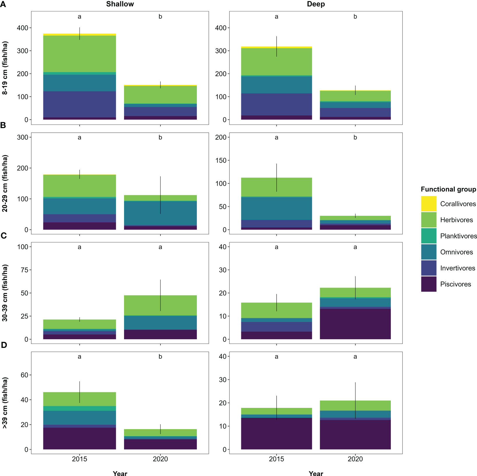 Fish abundance per size class (A-D) per year obtained from extended surveys. Values represent mean abundance for each size class with error bars indicating standard error. The proportional contribution of functional groups to each size class per year is shown in coloured shades. Note the different y-axis scaling. Letters indicate significant differences (p < 0.05) between years for overall abundance per size class (Table S11).