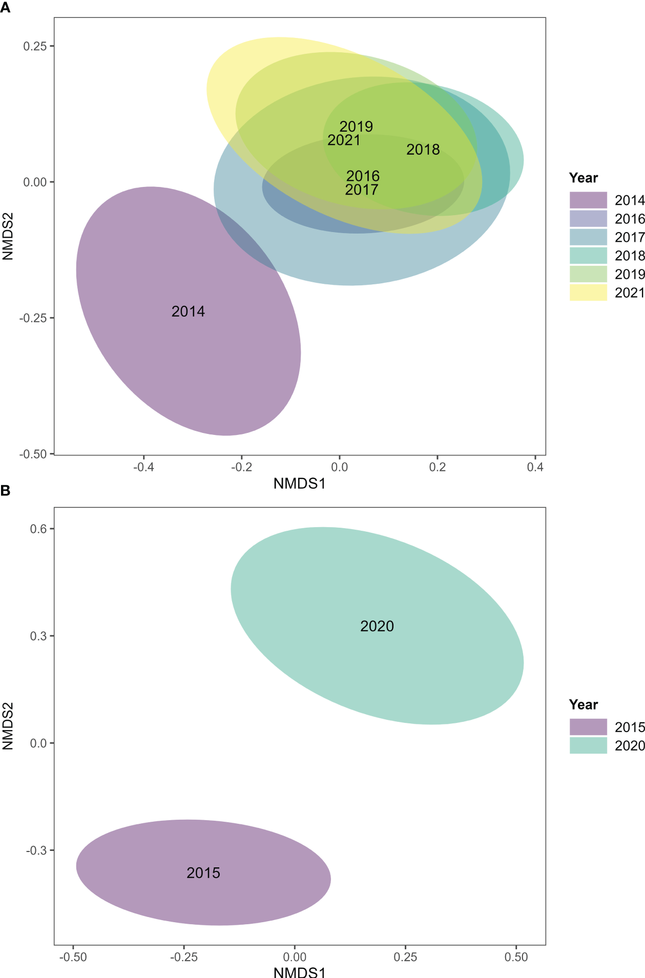 Non-metric multidimensional scaling (nMDS) of (A) fish communities in 2014, 2016–2019 and 2021 (indicator data set) and in (B) 2015 and 2020 (extended data set). Labels of years in the plots indicate annual centroids, shaded areas indicate 95% confidence regions. To improve readability, overlapping labels (2016, 2017) in (A) where manually moved apart. Permutation-based ecological null models were used to validate the nMDS ordination fit (see Methods and Figure S2).