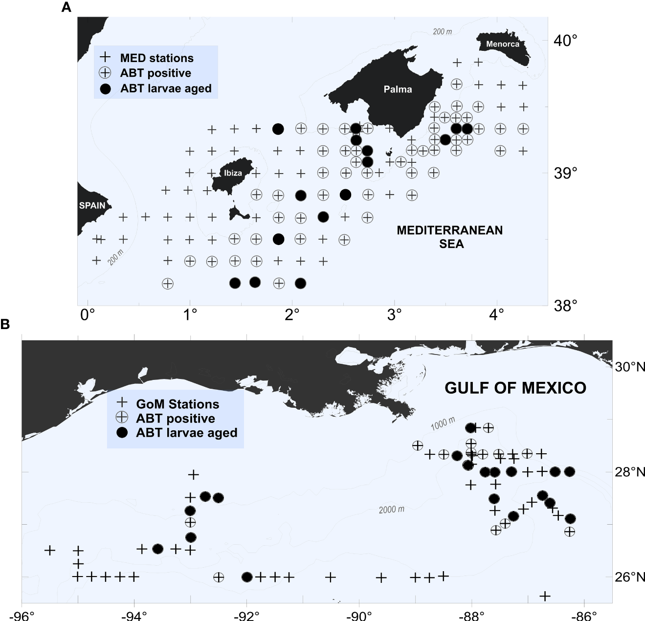 Station locations, presence/absence, and location of aged larval bluefin tuna (Thunnus thynnus) from (A) western Mediterranean (MED) and (B) Gulf of Mexico (GoM) during the 2014 spawning season.