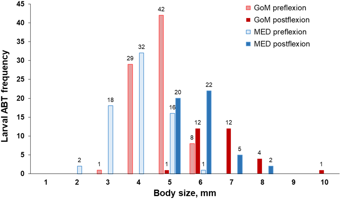 Back-calculated spawning took place throughout the sampling period in both spawning areas yet developmental stages were unevenly represented (Figure 2), with preflexion fish dominating (64%) catches in both spawning grounds. Postflexion larvae ranged from 5.71 to 10.16 mm. In the GoM, seven flexion stage larvae ranged from 6.11 to 7.08 mm, and they overlapped in size with preflexion and postflexion larvae.