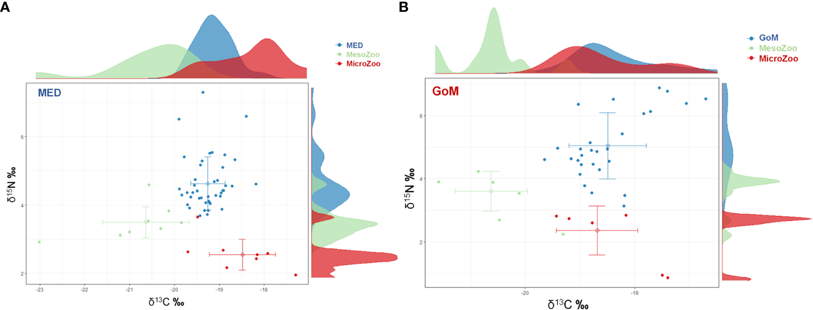 In order to augment SCA, a biogeochemical approach utilizing natural abundances of stable isotopes of nitrogen (15N/14N, represented as δ15N) and carbon (13C/12C or δ13C) from consumers’ tissues has proven useful in ecosystem studies (Fry, 2006; Montoya, 2007; Varela et al., 2019; Hildebrand, 2022) including the GoM (Richards et al., 2023). Isotopic ratios reflect feeding pathways (Bodin et al., 2021). In general, higher δ15N values specify higher trophic levels (Post, 2002), and δ13C reflects food web dynamics (Bodin et al., 2021). In pelagic environments, phytoplankton are the base of the feeding pathway. The primary producers have low δ15N with variable δ13C values reflecting primary producers. Moving upwards in the food web, small zooplankton will in turn have larger (i.e., more enriched) isotopic values and larval fishes that consume a copepod-rich diet will have even more enriched values.