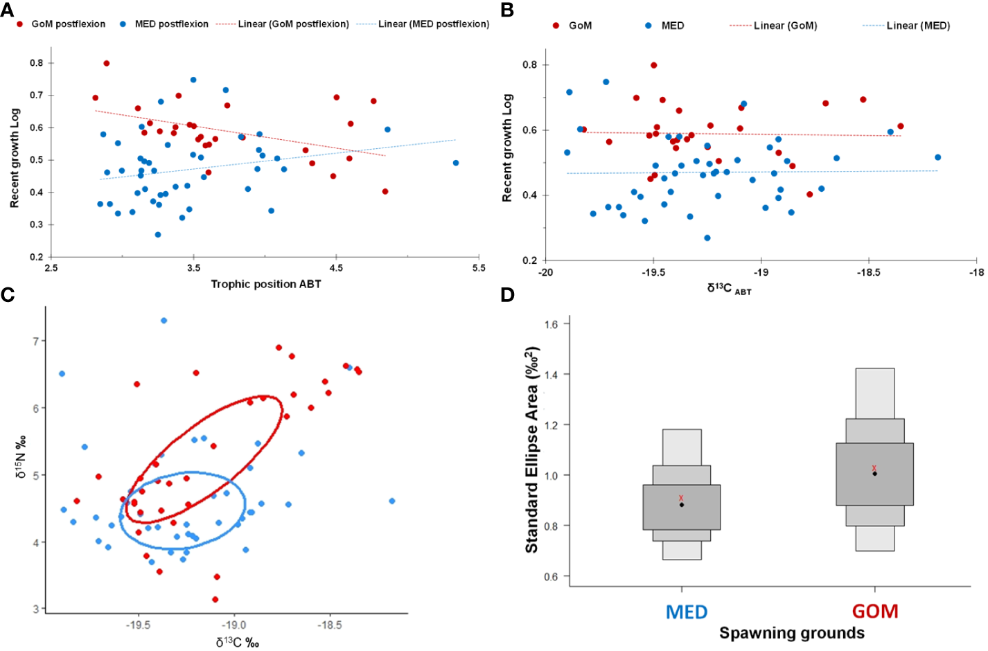 Differences between isotopic signatures between preflexion and postflexion ontogenetic stages reflect transgenerational maternal transmission of the nitrogen isotopic signature (Uriarte et al., 2016; Laiz-Carrión et al., 2019). Preflexion ABT larvae have higher nitrogen values, reflecting the maternal ABT adult signature (Quintanilla et al., 2023). Consequently, the trophic information based on SIA (TP, isotopic niche width, and overlap analyses) should only include postflexion tuna larvae. Laiz-Carrión et al. (2015) observed trophic ecology disparities for ABT larvae between MED and GoM. These studies called for further research to investigate and evaluate the implications of these trophic differences on daily growth variability. In this way, a direct relationship between isotopic signatures and growth strategies in larval stages can be determined, providing a useful method to analyze the trophic influence of trophic pathways on growth variability (Laiz-Carrión et al., 2011; Pepin et al., 2015; Quintanilla et al., 2015; Quintanilla et al., 2020).