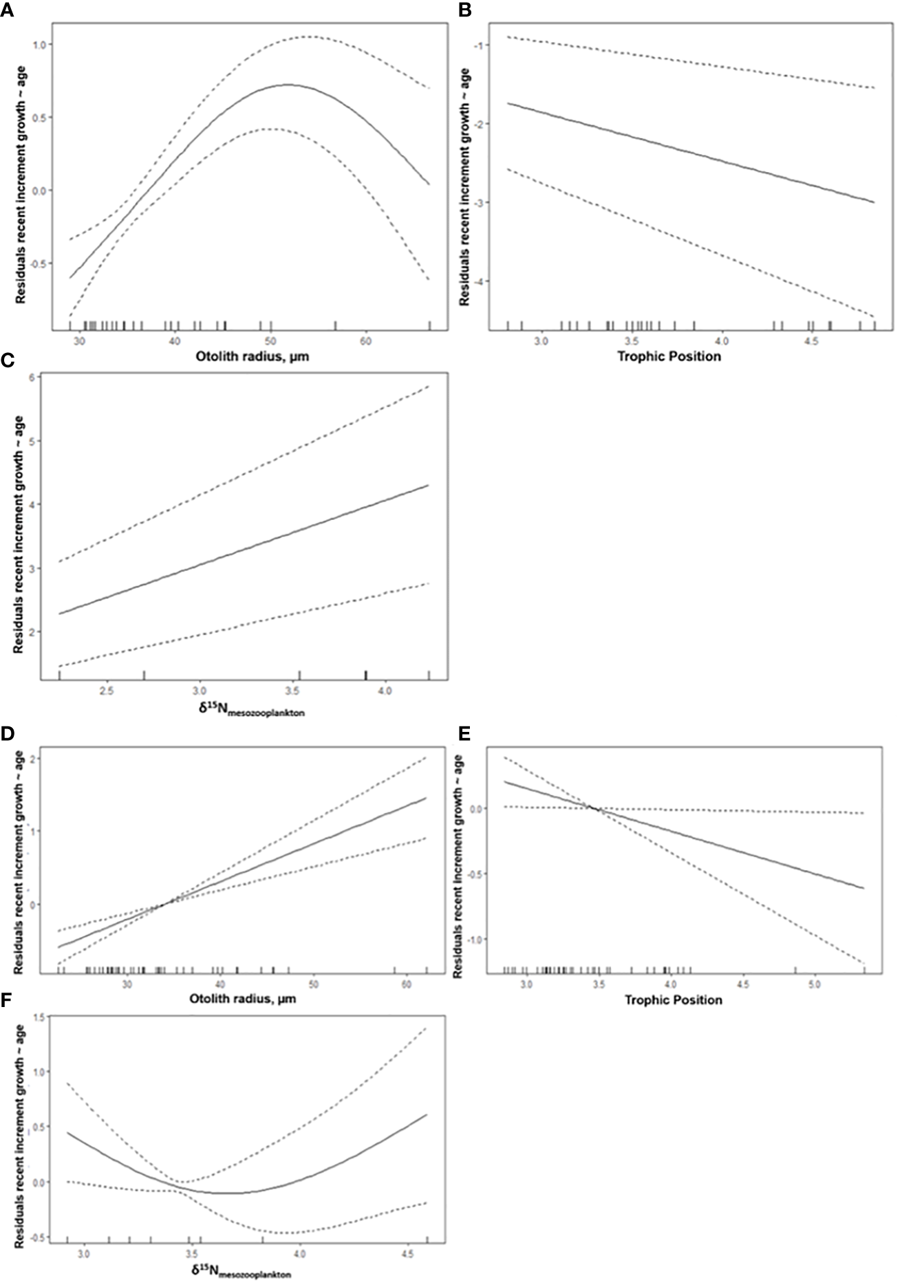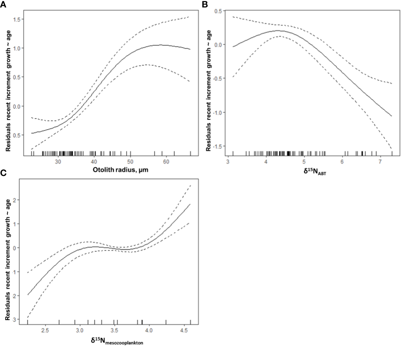 For larval ABT, the δ15N values are linked to the corresponding δ15N zooplankton prey baseline that allows the estimation of trophic position (TP) as well as the corresponding trophic niche width (Laiz-Carrión et al., 2015; Laiz-Carrión et al., 2019). Nitrogen and carbon stable isotope signatures can help to characterize the complex ecosystem of migratory species (Laiz-Carrión et al., 2013; Laiz-Carrión et al., 2015; García et al., 2017; Laiz-Carrión et al., 2019). Stable isotope analysis (SIA) of nitrogen from adult muscle tissues reflects the signature of the combined prey ingested for several months; however, for larval fishes the SIA signatures reflect only a few days of larval life (Peterson and Fry, 1987; Logan et al., 2006; Montoya, 2007). SIA is a suitable method for testing hypotheses on developmental changes in sources of nutrition as it provides information on assimilated food (Laiz-Carrión et al., 2011; Laiz-Carrión et al., 2019). Combining larval SIA along with recent otolith growth is strategic as both metrics reflect recent somatic and environmental conditions. Furthermore, the analysis of nitrogen stable isotopes from prey to predators can be used as a proxy for estimating trophic position (TP) which reflects the efficiency of nitrogen transfer through a food web (Montoya, 2007; Caut et al., 2009). SIA provides time-integrated information about assimilated diet over longer timeframes than SCA (Peterson and Fry, 1987) and TP indicates the ecological role of species in the ecosystem (Post, 2002; Quezada-Romegialli et al., 2018. Therefore, estimating the TP of organisms is crucial for understanding trophodynamics and the influence of trophic interactions on larval growth variability throughout ontogenetic development (Pepin and Dower, 2007; Laiz-Carrión et al., 2019; Quintanilla et al., 2020).