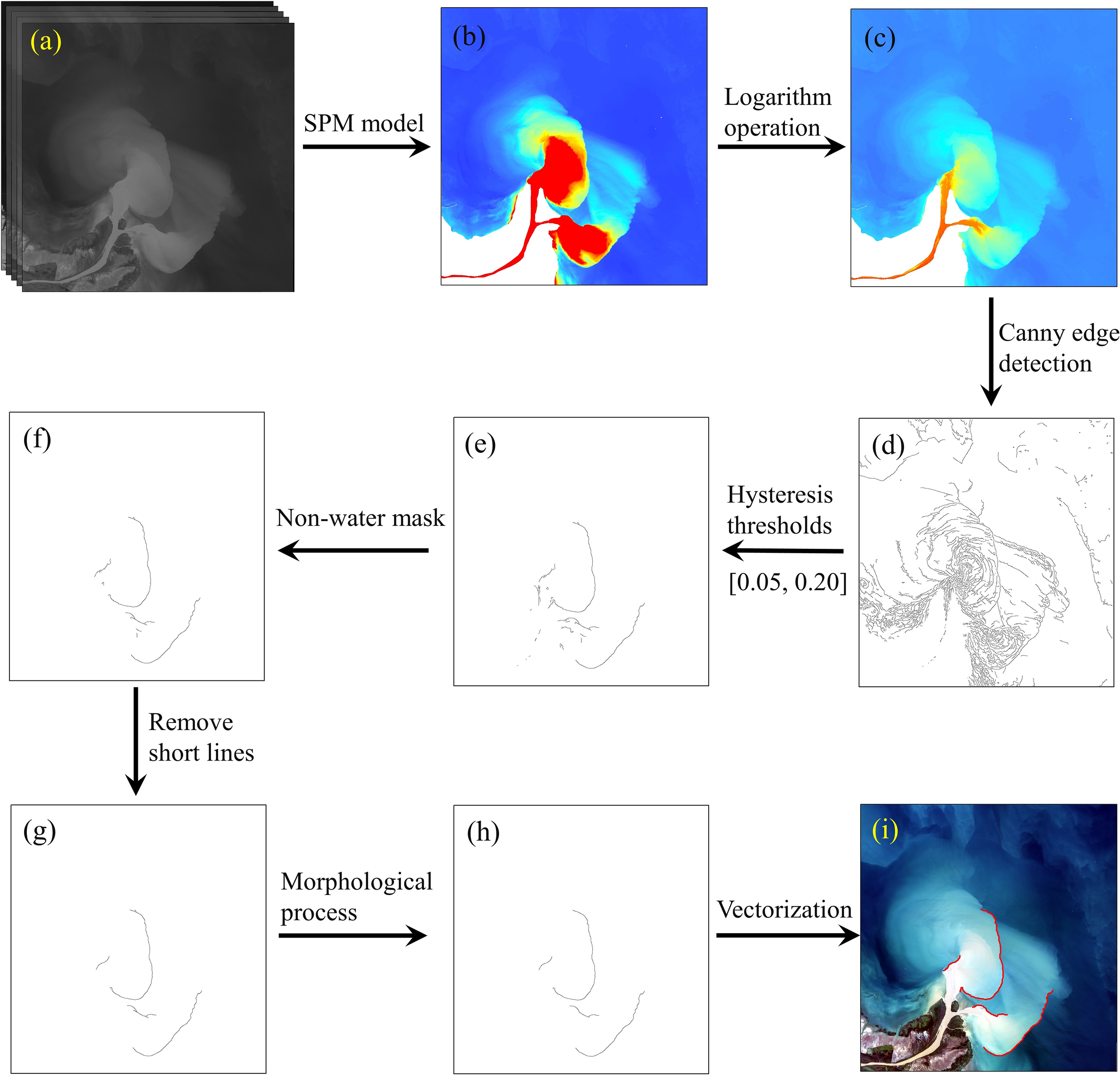 In this study, a combined strategy of SPM quantitative inversion model and Canny edge detection algorithm was used to extract the locations of YBDL. The flowchart for YBDL extraction was shown in Figure 3. The Canny algorithm was the key to the whole framework and consisted of four steps (Canny, 1986):