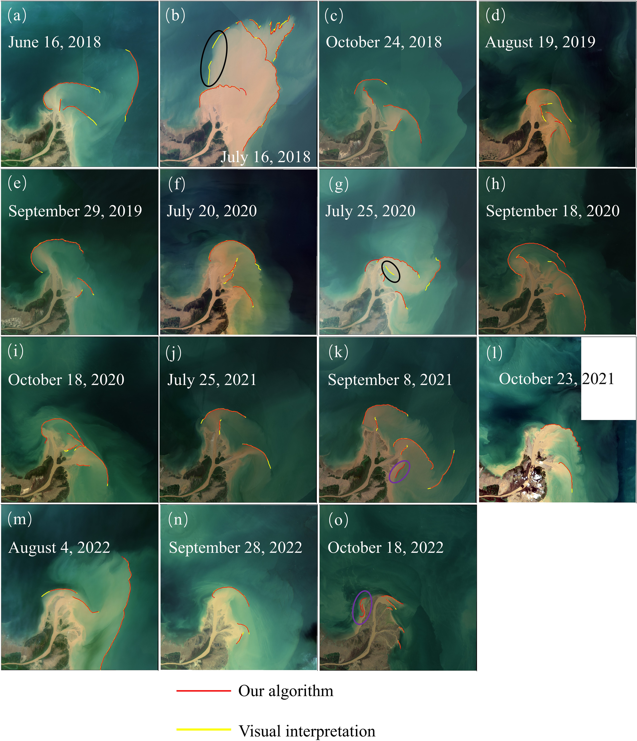 To assess the accuracy of YBDL extraction, we randomly selected 15 images and compared the differences between the YBDL automatically extracted by our method and the results of visual interpretation (Figure 4). These imageries were typically representative, covering all the months involved in this study and the multiple distribution patterns of the YBDL. It could be seen that the locations of the YBDL extracted by our approach were in good agreement with the visual results, and the difference in YBDL length was also minor, with an average relative error of 10.53% (Figure 4). Furthermore, there were few omissions and redundancies for YBDL (Marked by black and purple ellipse in Figure 4). Thus, the comparisons indicated that our algorithm had high practicability and robustness for the YBDL at the YRE.