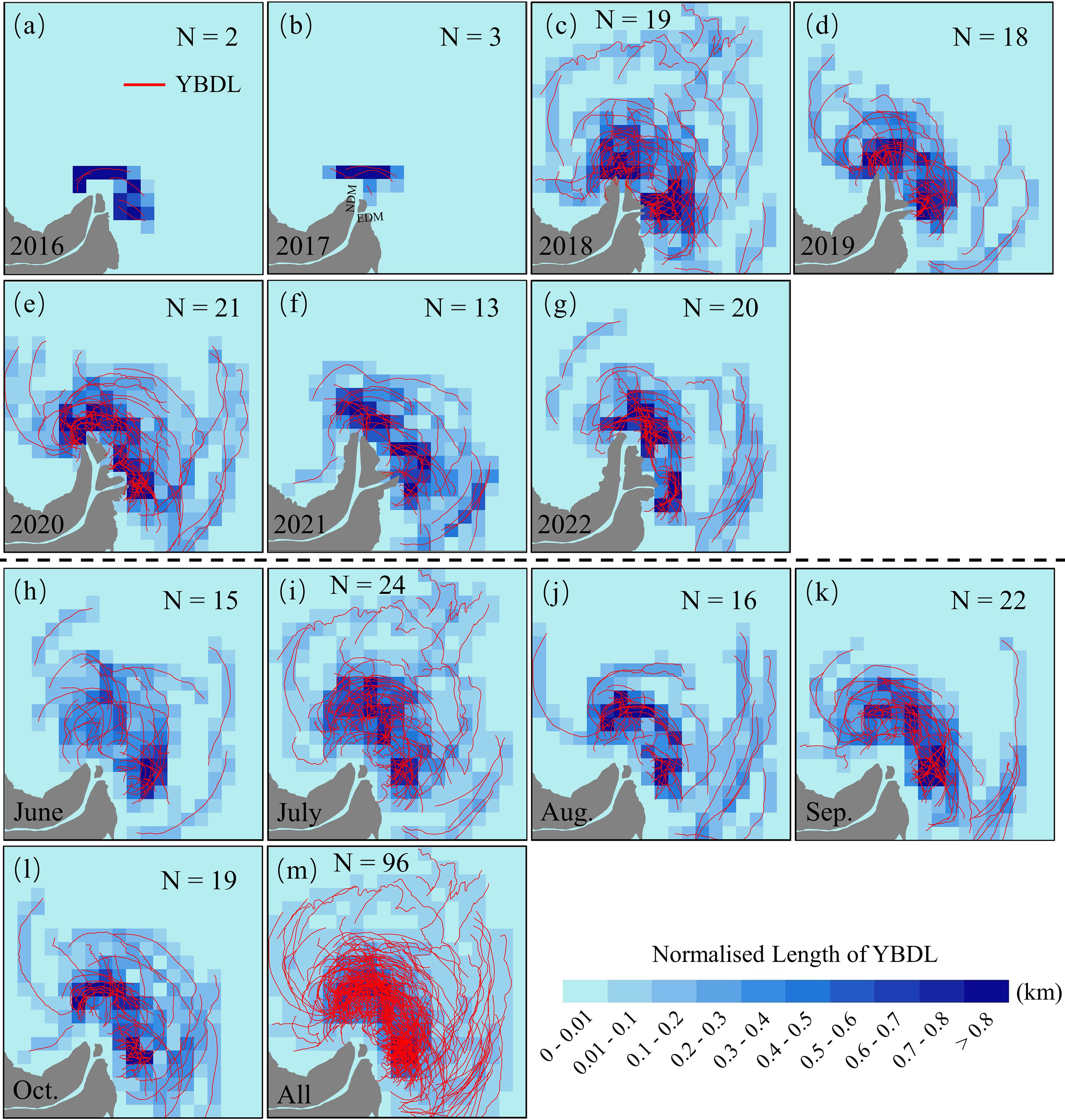 Spatial distributions of YBDL in the Yellow River estuary and normalised length of YBDL within the 2km 2km grid. (A–G) Annual YBDL distributions from 2016-2022. (H–L) Monthly YBDL distributions from June to October. (M) Stacked distribution of all YBDL. N denotes the number of satellite images for which YBDL can be detected. The NDM and EDM marked in (B) indicate the north distributary mouth and east distributary mouth, respectively.