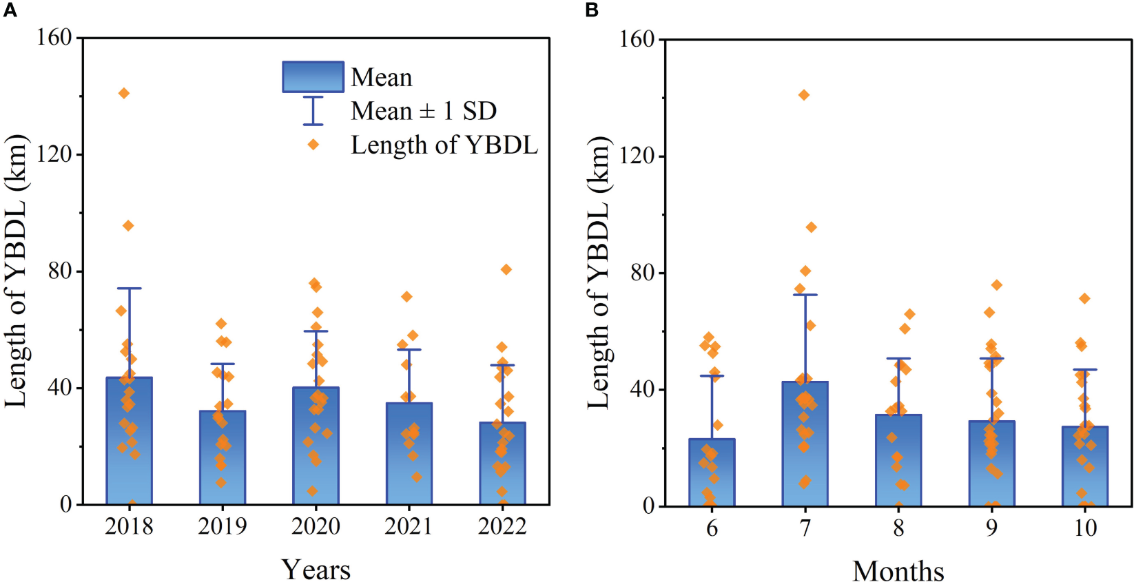 Statistics on the length of (A) interannual and (B) monthly YBDL. Data for 2016 and 2017 are not shown in (A).