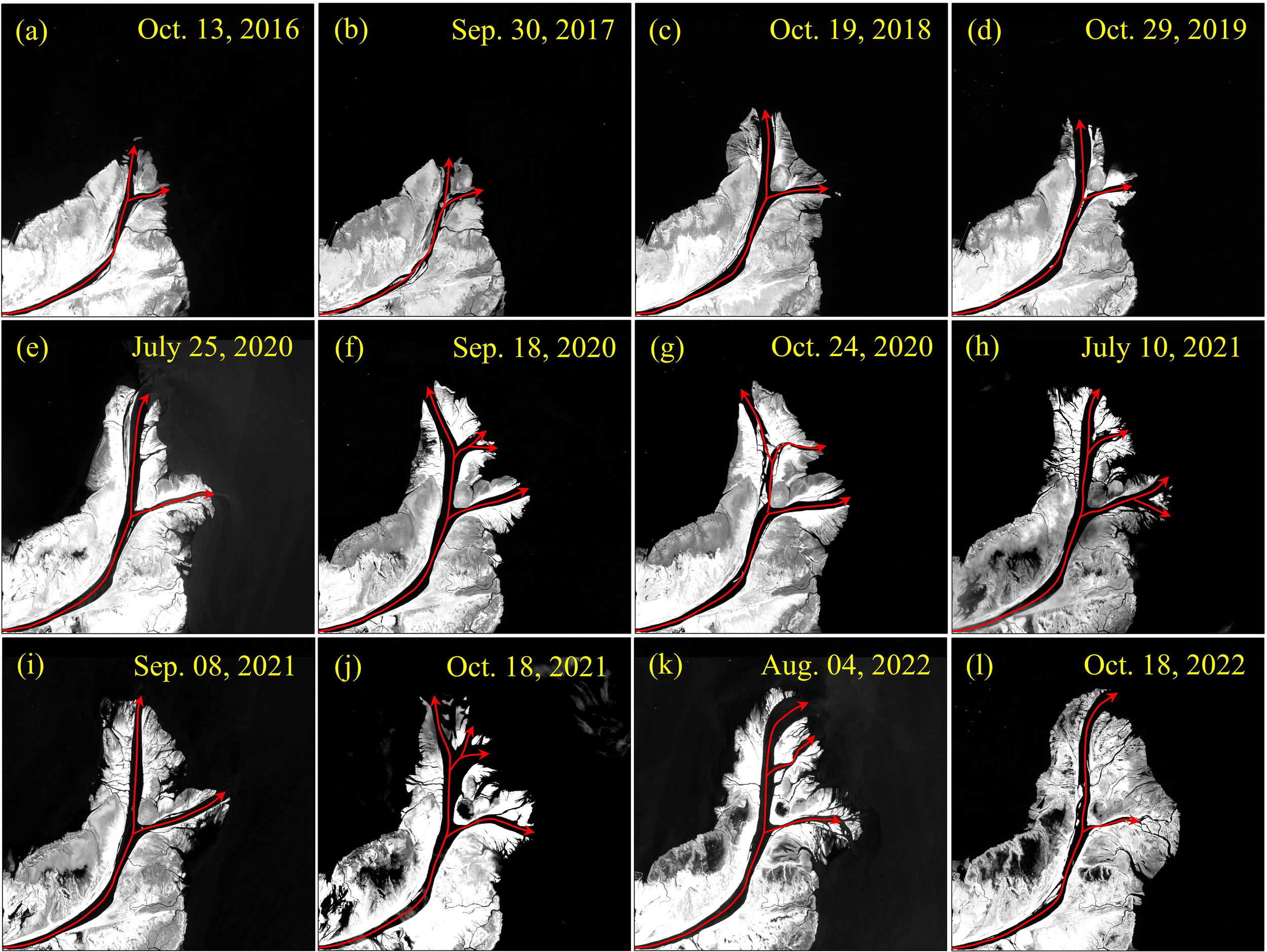 In this research, we used 40 Landsat-8/9 OLI images and 73 Sentinel-2A/B MSI images acquired during the flood seasons of 2016-2022 (Figure 2). A total of 292 Sentinel-2 MSI images were actually used, as it took four images to provide complete coverage of the study area. Note that considering the less available images in summer caused by cloud cover, we did not discard the images with thin cloud cover, but extracted the YBDL from them by visual interpretation in order to increase the observation frequency of YBDL as much as possible. Furthermore, 16 hourly GOCI imageries acquired on October 4, 2018 and July 20, 2020 were selected to assess the impacts of flood and ebb tides on YBDL variations off the estuary.