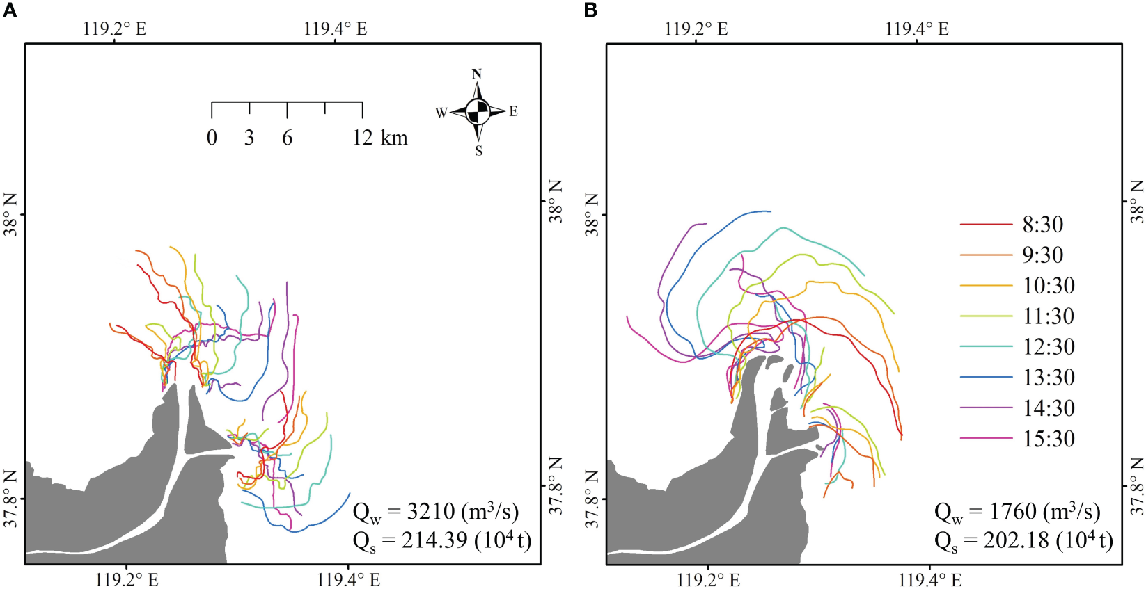 The daily riverine runoff and sediment load data at the Lijin Station, the closest hydrological gauging stations to estuary (green triangle in Figure 1B), were collected from the China River Sediment Bulletin (http://www.mwr.gov.cn/sj/tjgb/zghlnsgb/). Hourly wind speed data with the spatial resolution of 0.25° × 0.25° was obtained from the European Centre for Medium-Range Weather Forecasts (https://cds.climate.copernicus.eu/).