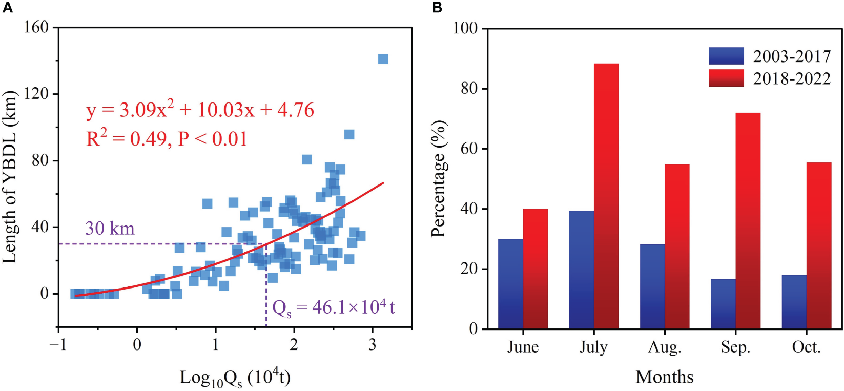 Figure 11 (A) Relationship between YBDL length and riverine sediment load. (B) Percentage of days with high sediment discharge (> 46.1×104 t/d) during the flood season from 2003 to 2022.