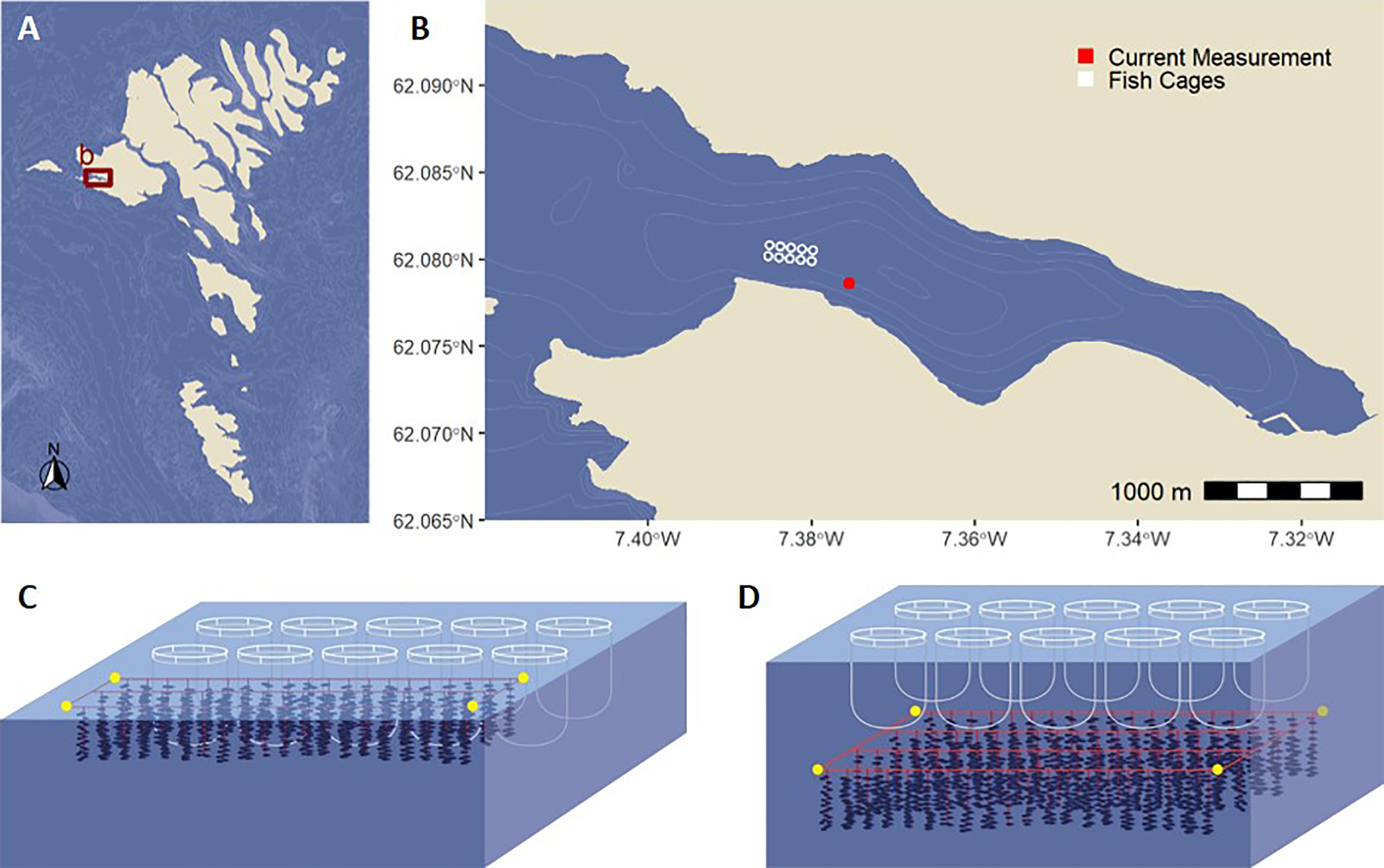 Map of the Faroe Islands (A) and the location of the studied fjord. (B) The study site showing the location of the fish farm and the current measurement. Conceptual drawings of the modeled spatial locations of the Atlantic salmon farm and the blue mussel farm, with blue mussels at the surface next to the fish farm (C) and submerged below the fish farm (D).