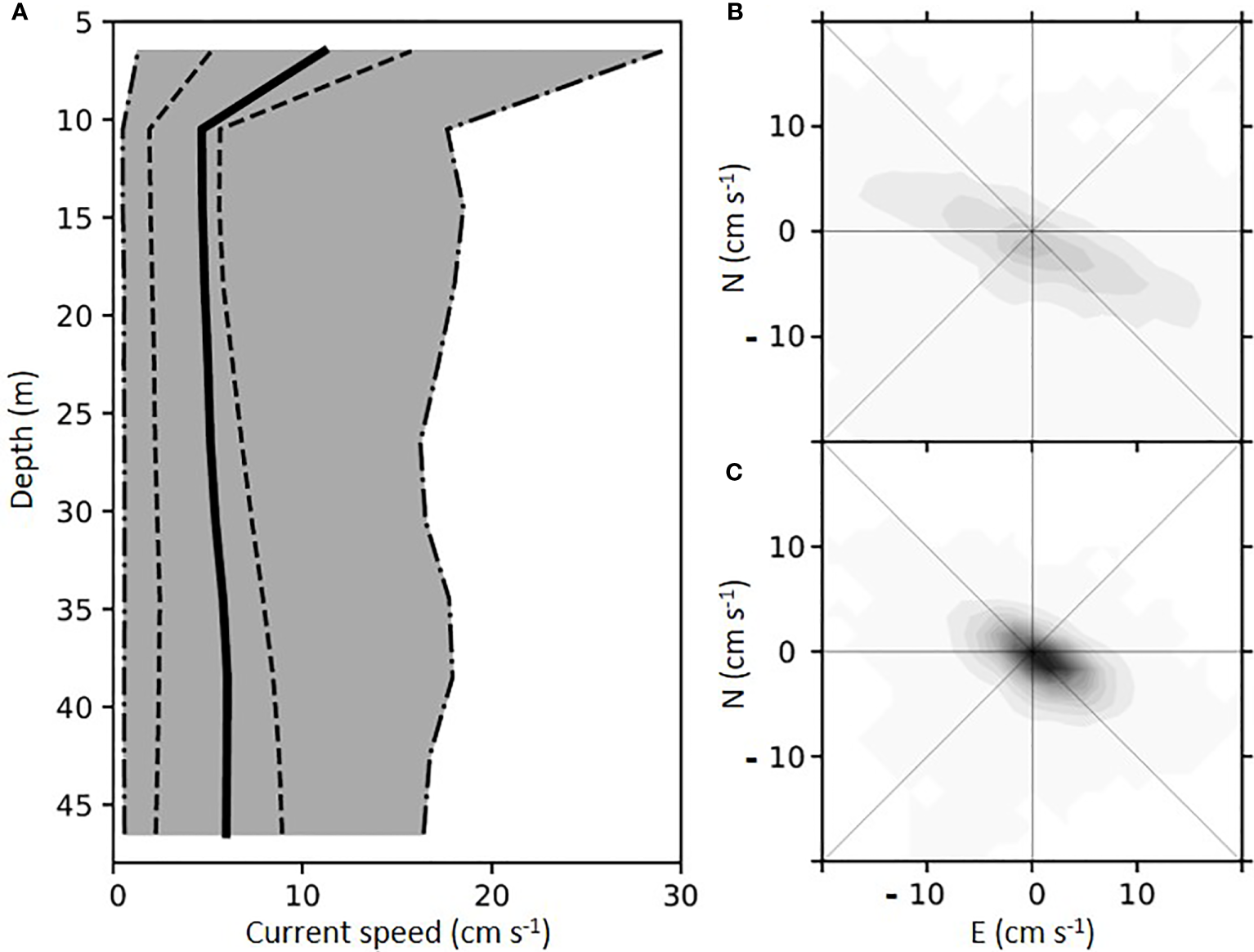 Currents were measured close to the farm with a bottom-mounted acoustic Doppler current profiler (ADCP) current meter, Teledyne RDI Workhorse Sentinel 300 kHz (Figure 1B). The bottom depth was 52 m, and vertical current profiles were measured every 5 min in 4 m bins from 7 February to 1 May 2017. The dispersion of PW was modeled according to the Lagrangian particle-tracking module in Cromey et al. (2002). The module assumes uniform currents in the horizontal plane. The model was forced with the time series of the observed currents, with linear interpolation through time and vertically between ADCP bins, i.e., depth.
