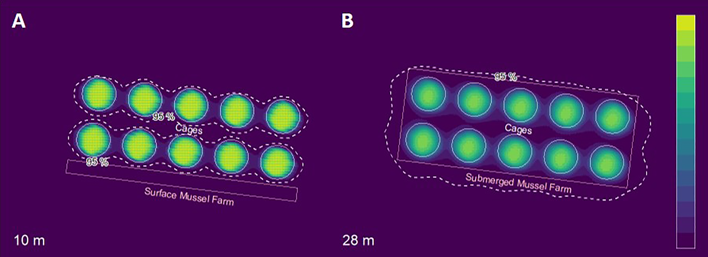 As vertical transport dominates the PW distribution around fish farms, it has been suggested that higher mitigation could be achieved by locating the extractive species below fish farms (Filgueira et al., 2017), and studies have explored IMTA with extractive species at the seabed (Cubillo et al., 2016; Jansen et al., 2019; Nederlof et al., 2020). However, the nature of fish farming implies that the living conditions at the seabed vary considerably during the course of a production cycle, especially in sheltered areas (á Norði et al., 2011). An alternative approach to extract particles in the vertical waste stream is to suspend the extractive species below the fish farm; a mitigation potential that has received little attention.