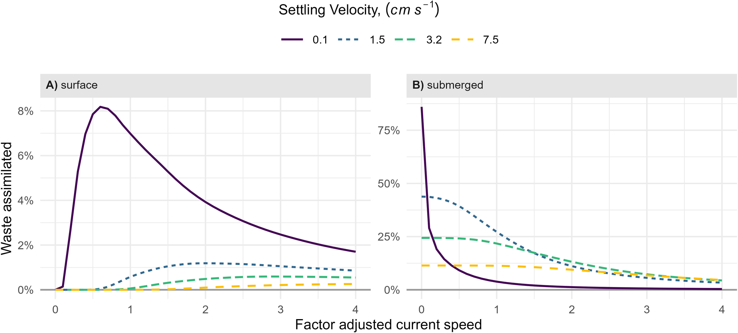 The mussels alter the vertical particle transport by consuming suspended particles and subsequent production of fecal pellets and possible pseudofeces that exhibit higher settling velocities (McKindsey et al., 2011). Thus, the capture of phytoplankton and zooplankton should be considered when investigating the alteration of particle transport in the vicinity of fish farms to accommodate ambient food supply. However, as this study investigates the potential removal of fish farm waste by the mussels, increased deposition of OM adjacent to the fish farm in the form of mussel feces from phytoplankton and zooplankton capture was not modeled.