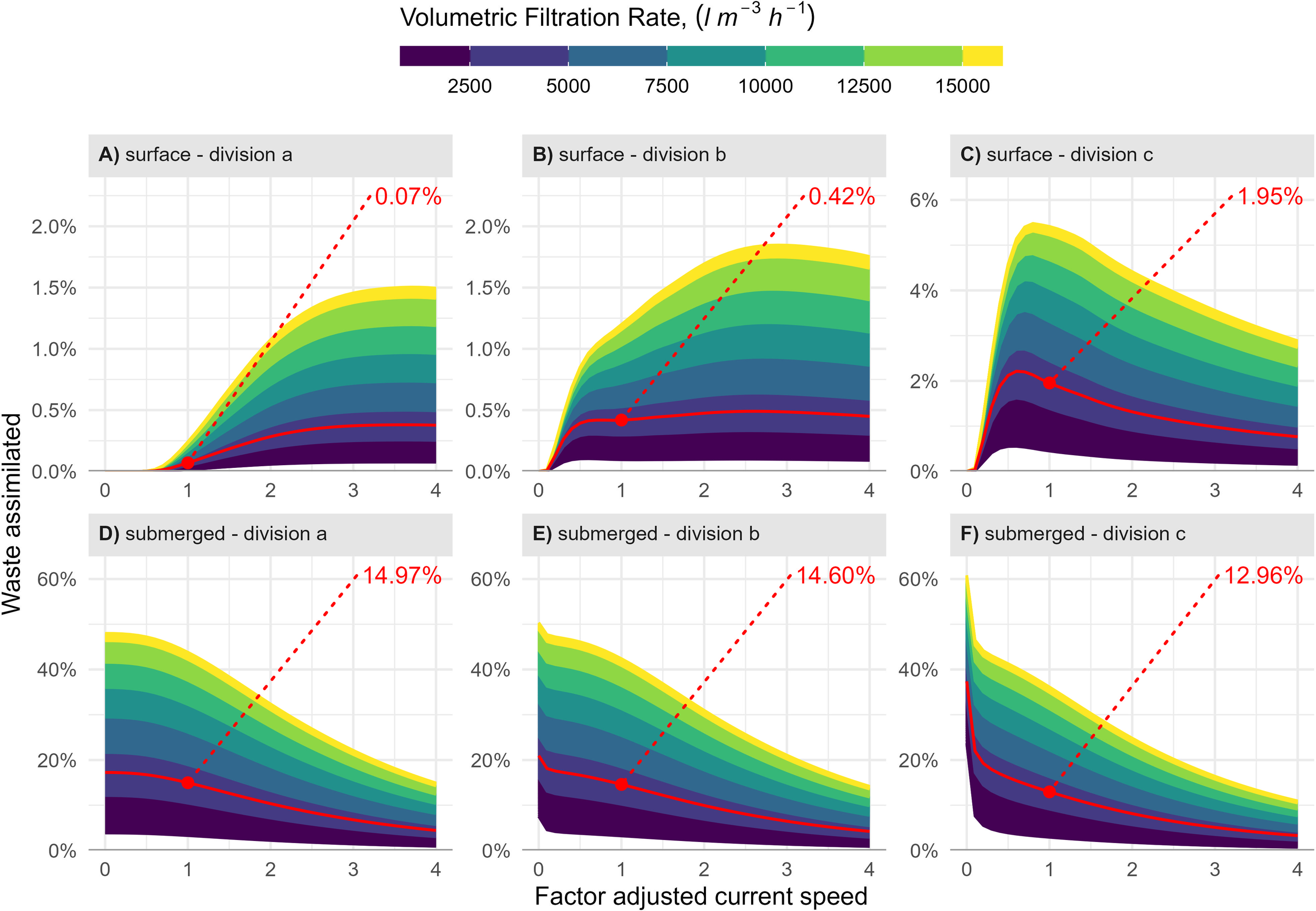 The general design of the fish farm is widely used in salmon farming and to investigate if the mitigation potential would be higher at other farms with different hydrodynamic settings, a sensitivity analysis was conducted on the current speed. A sensitivity analysis was likewise performed on the density of blue mussels, as it is variable on passive spat collectors. Size and settling velocities of fish fecal particles are highly variable and depend on feed ingredients, fish size, and hydrodynamics (Reid et al., 2009); and in general, the information on the size fractionations of waste particles is scarce (Nederlof et al., 2022). Thus, a sensitivity analysis was also conducted to investigate how the fraction of slowly settling particles influenced the mitigation performance of the blue mussel farms.