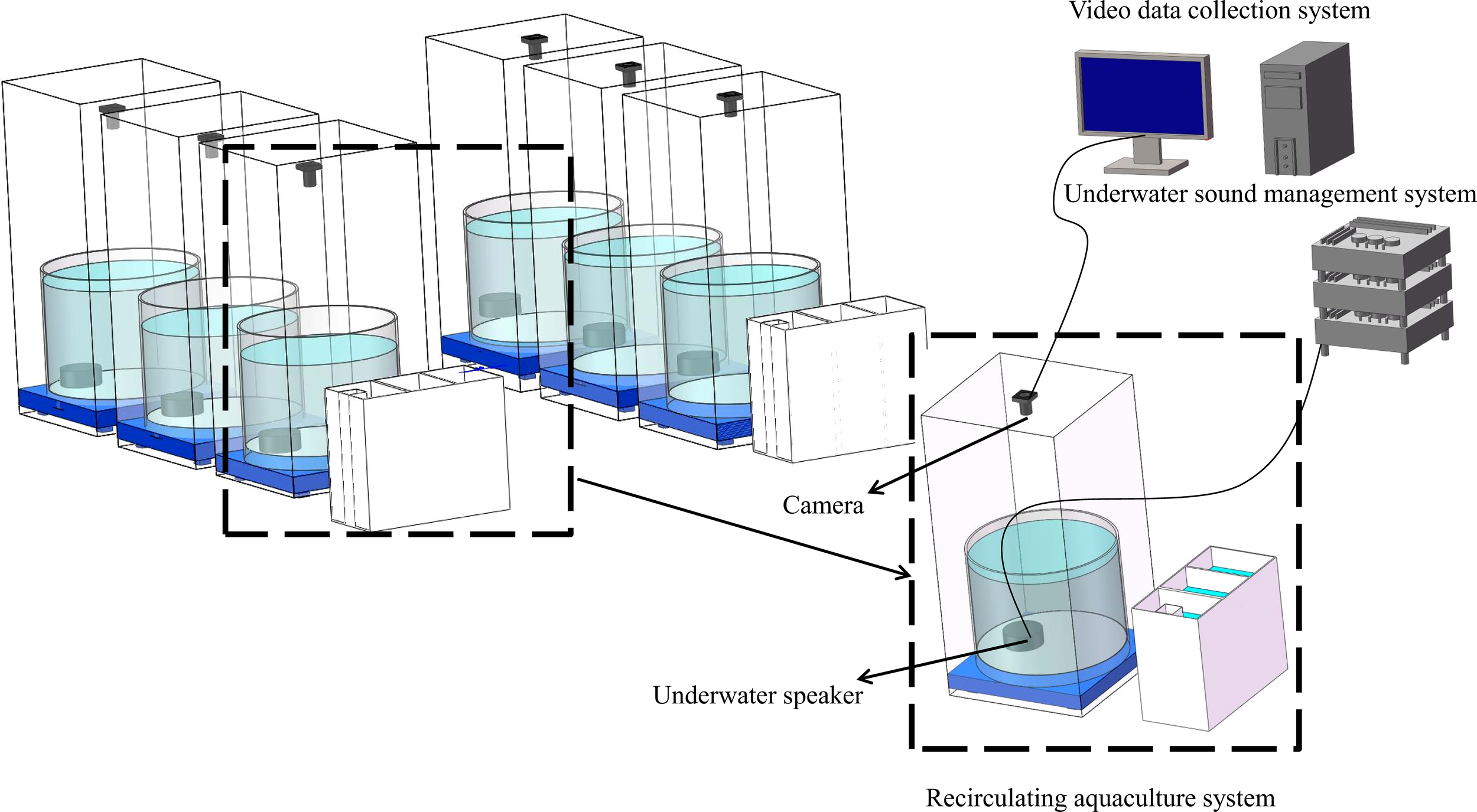 The experimental system was established in a quiet laboratory with measures like wrapping the stainless steel frame with blackout cloth, padding the culture pool’s bottom with a PVC shock-absorbing tray, employing liquid oxygen for oxygen supply, using a fixed biological bed, and wrapping PVC pipes with sound-absorbing materials to mitigate interference from environmental noise and system operational noise.