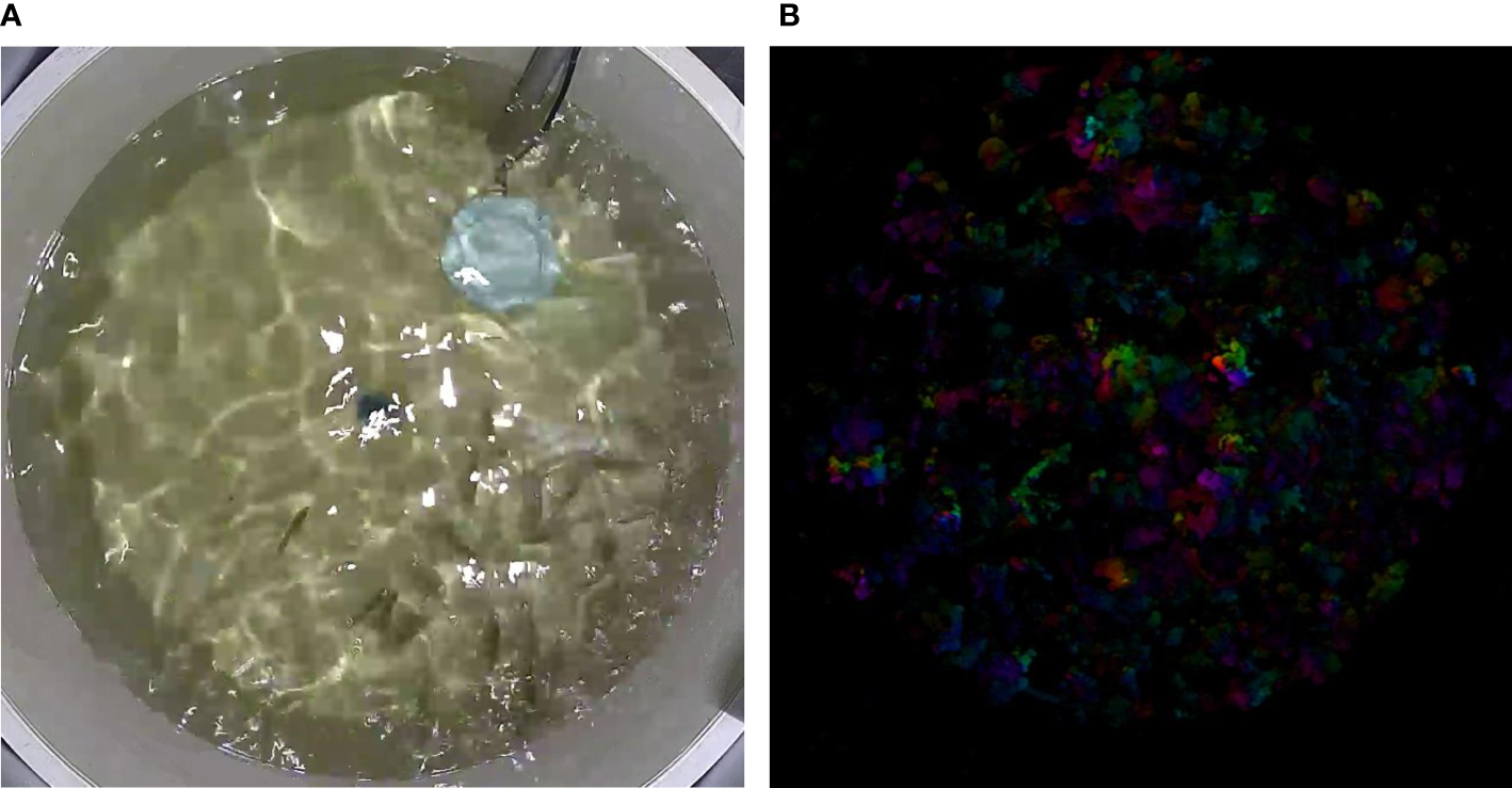 For the analysis of group swimming behavior, the Mask RCNN technique was employed (Figure 3). From each video, 60 frames were extracted, and object instance segmentation was conducted on the experimental fish in the frames. This generated a segmentation mask for each experimental fish, enabling their identification and localization (He et al., 2020). To evaluate the cohesion of swimming, the distance between every experimental fish and its two nearest neighbors within the group was computed. A line connecting a fish’s head and tail represented its swimming direction. To evaluate the polarity of swimming, the angle formed by the swimming direction of an experimental fish and its two closest neighbors was utilized.