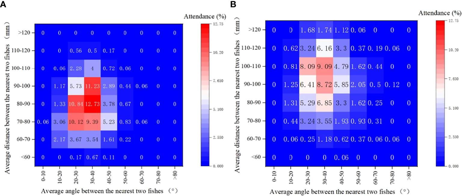 Heat Map Depicting the Distribution of Largemouth Bass Swimming Behavior in Both Experimental Tanks: The heat map visualizes the variations in the swimming behavior of largemouth bass in response to the experimental conditions. Both the average angle (horizontal axis) and average distance (vertical axis) between fish are represented. (A) Ambient Group: Depicts the swimming behavior distribution under normal conditions. (B) Noise Group: Illustrates the altered swimming behavior under the influence of equipment noise.