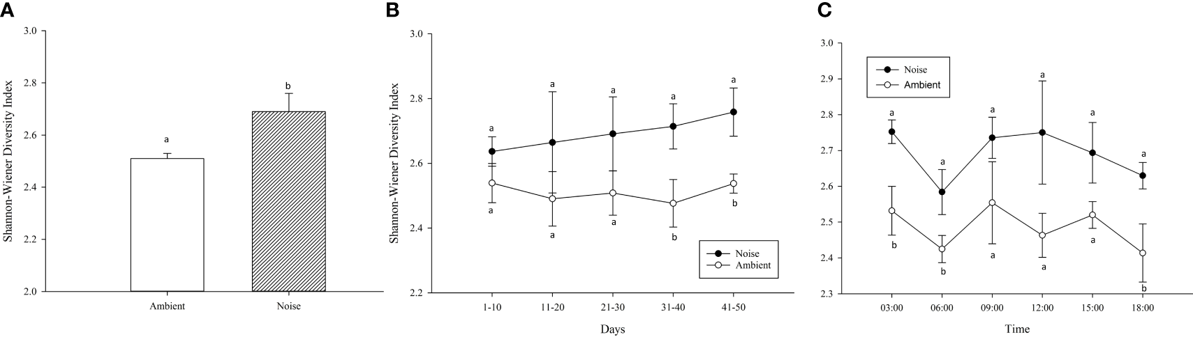 Variation in Shannon-Wiener Diversity Index (SWDI) Reflecting Swimming Behavior Diversity in Largemouth Bass Populations Across Noise and Ambient Groups: This figure illustrates the diverse swimming behaviors of largemouth bass in response to both experimental conditions using the SWDI. (A) Mean SWDI Throughout the Experiment. (B) Mean SWDI for Each 10-Day Period. (C) Mean SWDI at Different Time Points of the Day.