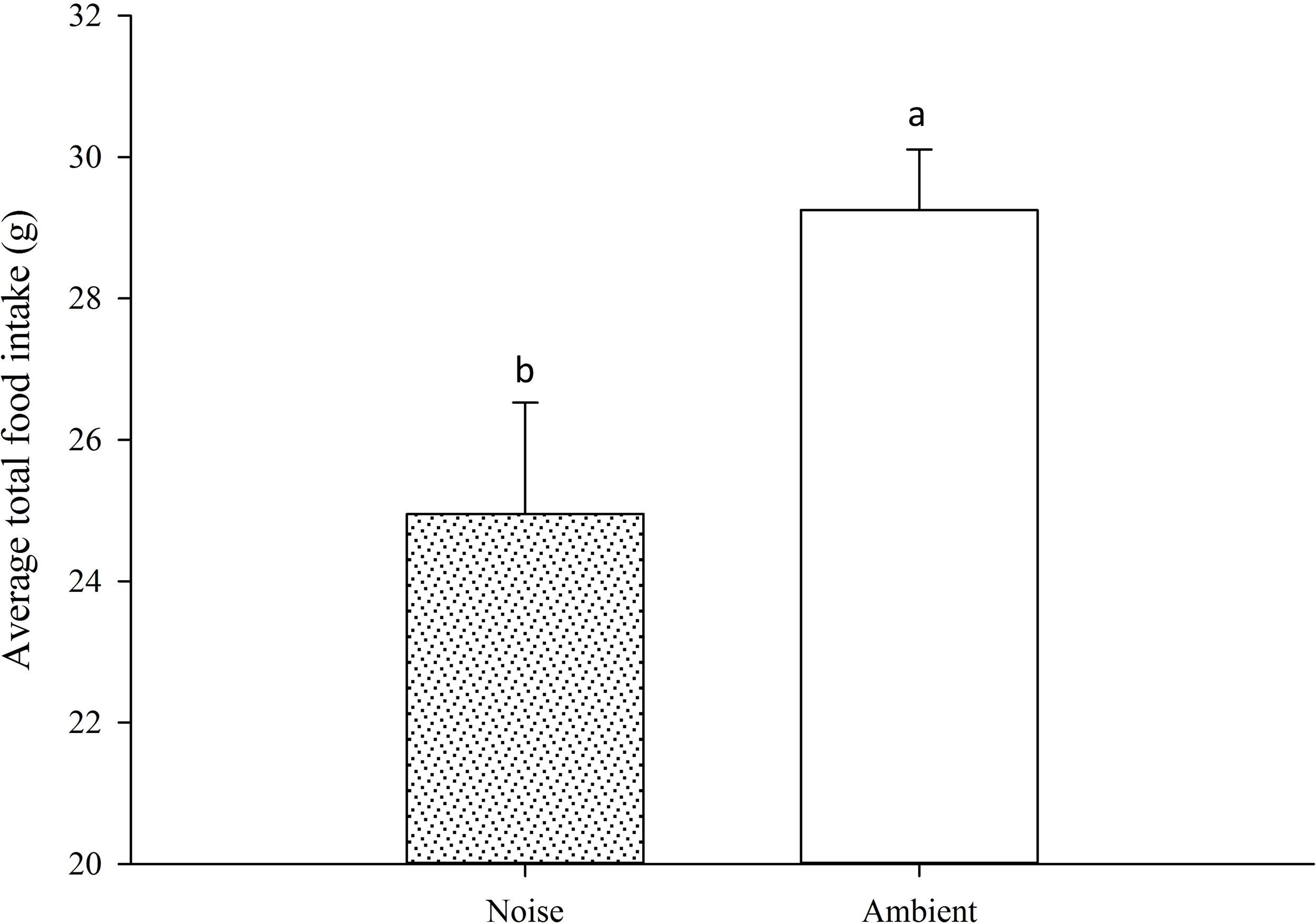 Total Food Intake Comparison: This figure illustrates the overall contrast in food consumption between the Noise and Ambient groups throughout the entire experimental duration. Differences marked with different lowercase letters are considered significant.