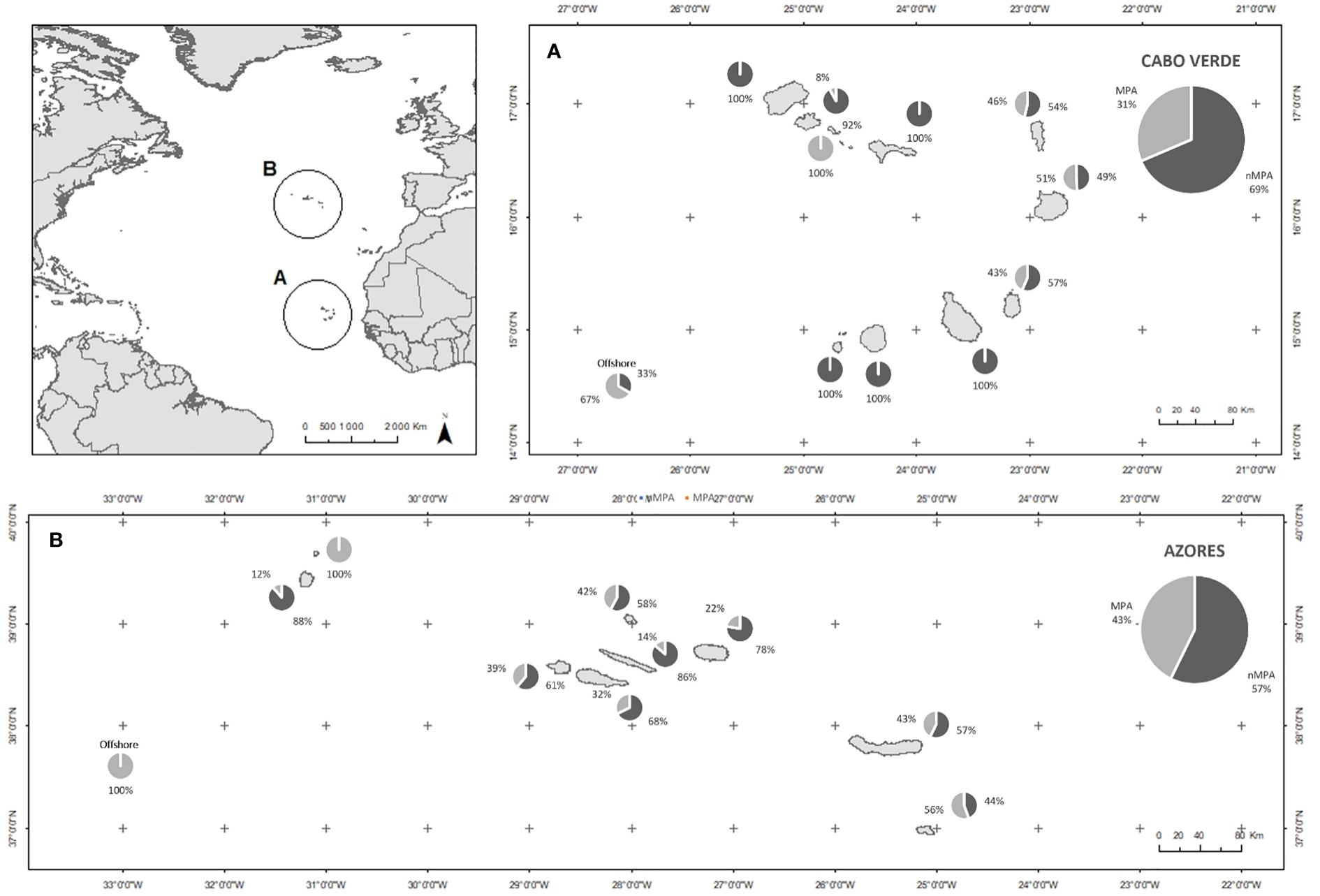 Map of the two study areas, (A) Cabo Verde and (B) Azores. Also showing the percentage of studies occurring inside MPAs (light grey) in front of the percentage of those that are conduct outside of MPAs (dark grey). Finding the general value for both archipelagos and the individual values of the islands for each study area.