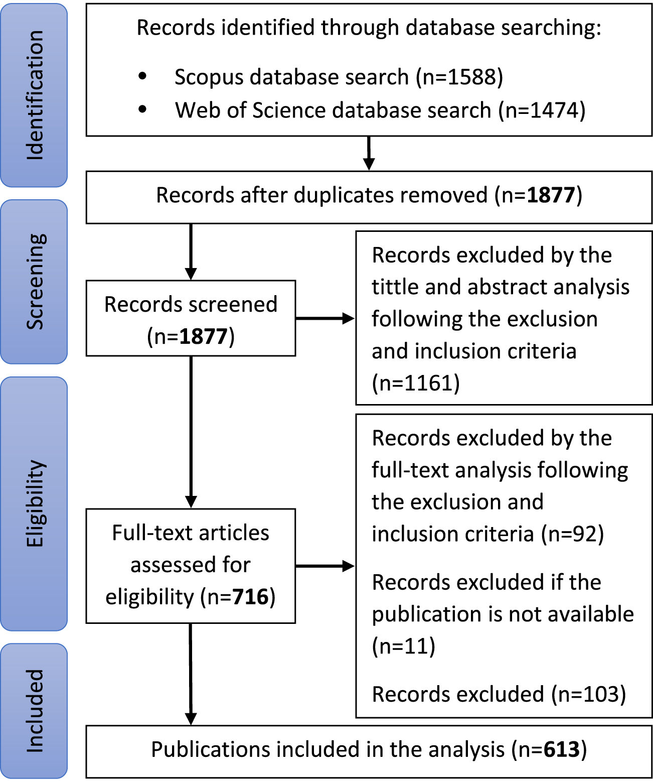 The screening process started with the peer-analysis of the title and abstract of these 1877 publications. Using the inclusion and exclusion criteria (Table 1), 1161 were removed. For the 716 remaining publications, the full text of each eligible article was then reviewed for relevance using the same inclusion and exclusion criteria as in the screening process. Ninety-two articles were removed, and 11 were excluded as the full-text publications were unavailable. Finally, 613 publications were retained for further analysis (Figure 2).