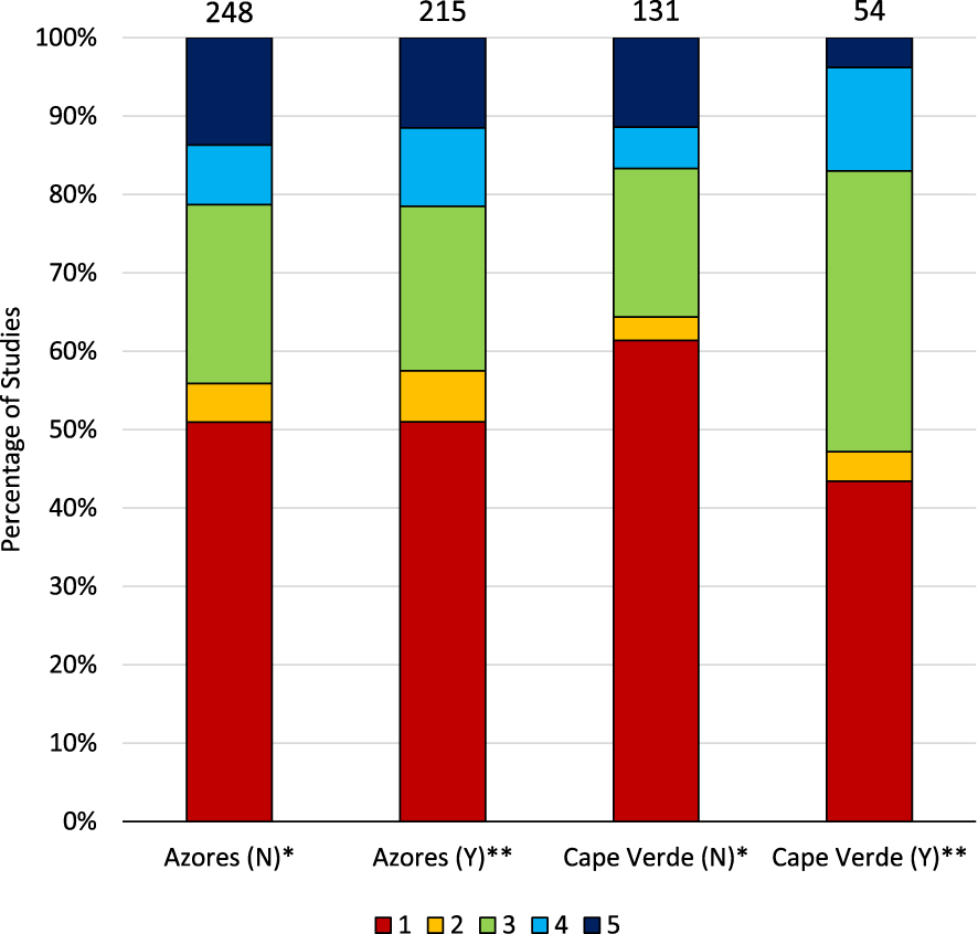 Proportion of groups recorded in the articles included for the Azores and Cabo Verde. The numbers above the bars correspond to the absolute value (N).