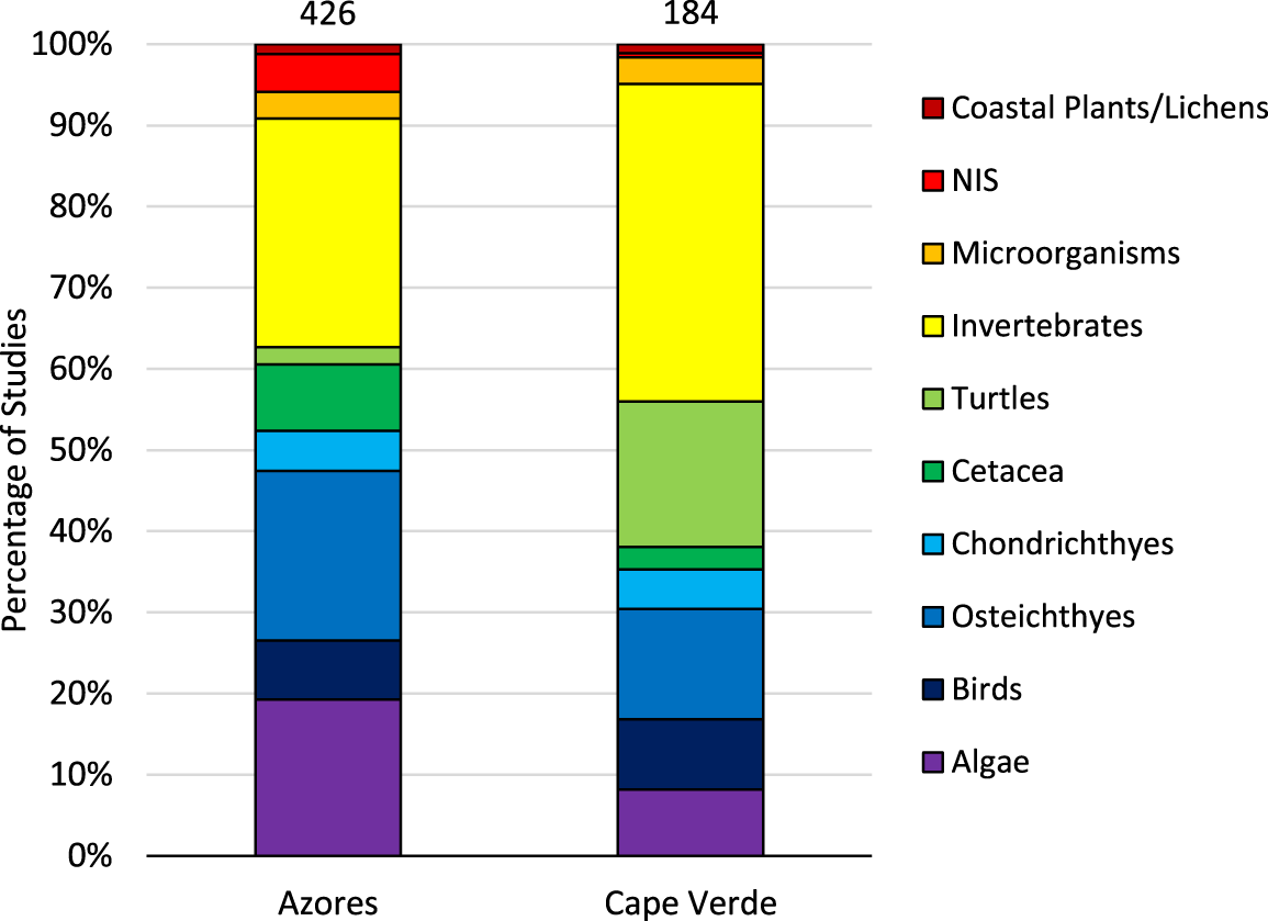 Invertebrates were the most represented group in the Azores and Cabo Verde studies, with 28.2% and 39.1%, respectively. For the Azores, it was followed by Osteichthyes (20.9%), algae (19.2%), cetaceans (8.2%), birds (7.3%), Chondrichthyes (4.9%), NIS (4.7%), microorganisms (3.3%), turtles (2.1%) and finally coastal plants and lichens (1.2%). However, in Cabo Verde, the invertebrate group was followed by turtles (17.9%), Osteichthyes (13.6%), birds (8.7%), algae (8.2%), Chondrichthyes (4.9%), microorganisms (3.3%), cetaceans (2.7%), coastal plants and lichens (1.1%) and finally, NIS (0.5%) as its research target. There is a greater interest in algae, cetaceans, and NIS in the Azores region compared to Cabo Verde, which presents a proportionally higher number of studies focusing on turtles. The Osteichthyes taxon is more represented in the Azores; however, in Cabo Verde, this group is the third most represented group (Figure 5).
