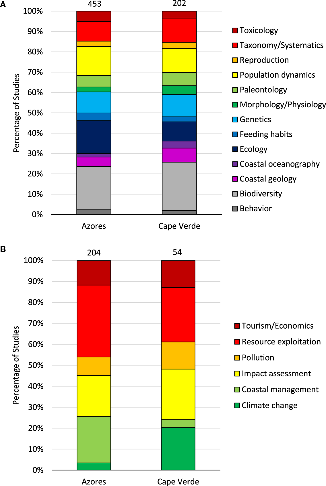Focusing on the different disciplines that were considered in the “Life and Earth Sciences” group, biodiversity studies are the most numerous, and reproduction and coastal oceanography are the least studied, in both archipelagos. On the other hand, within the “Human uses, Impacts and Management” group, we can find a common interest in resource exploitation and impact assessment studies. This is probably related to the intense pressure exerted by harvesters and fishermen in the Azores coastline and the impacts generated as a consequence of their activities (snagged or lost gear, anchoring of boats, etc.) on the benthic communities (Santos et al., 1995; Fauconnet et al., 2019). Cabo Verde’s coastline use is also intense and receives pollution from urban waste or dumping, and the urban development generates sediment accumulation along the coast (UNDP, 2009). Like in the Azores, there is also significant fishing and urban pressure in Cabo Verde, mainly because of whelks, fisheries (crustaceous and small pelagic fish), and tourism development (Bertrand et al., 2019).