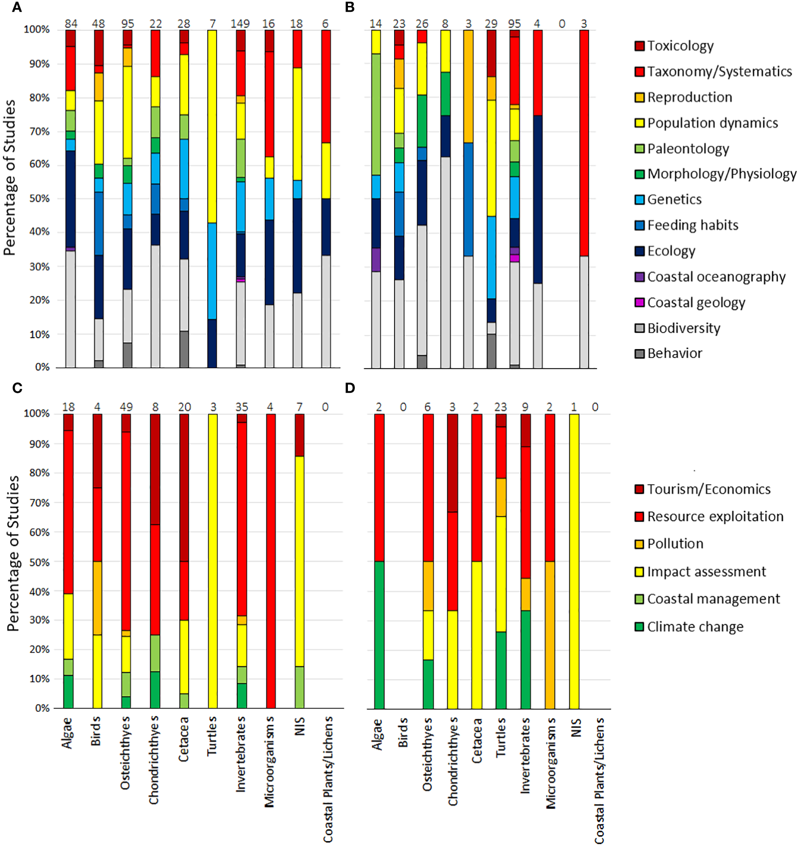 Information concerning the type of study was also extracted. First, it was indicated whether the study aimed to study any “group” of organisms. If so, these were divided into Algae, Invertebrates, Birds, Cetacea, Turtles, Osteichthyes, Chondrichthyes, Microorganisms, Coastal Plants/Lichens or NIS (Non-indigenous species). Then, all studies were grouped according to their “discipline”. The first group, corresponding to “Life and Earth Sciences”, comprises the disciplines of Paleontology, Biochemistry, Taxonomy/Systematics, Coastal geology, Biodiversity, Population dynamics, Ecology, Coastal oceanography, Behavior, Toxicology, Feeding habits, Genetics, Pathology, Reproduction, and Morphology/Physiology. The other group, “Human Uses, Impacts and Management”, includes de disciplines of Impact Assessment, Tourism/Economics, Resource exploitation, Coastal management, Climate change, and Pollution. A single study may consist of several groups of organisms and/or disciplines.