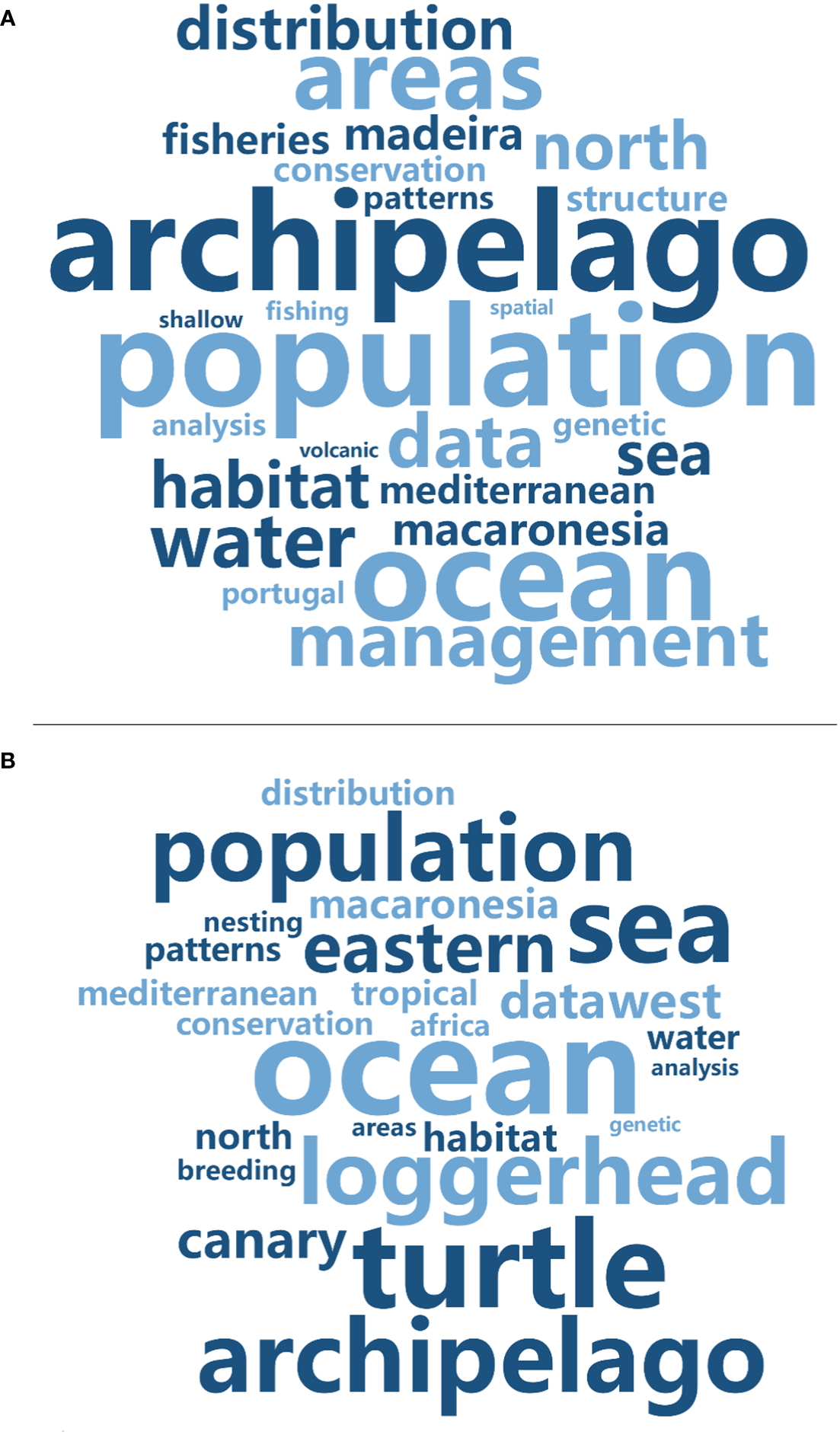 We found some differences by analyzing the frequency of words in the title, abstract, and keywords. Many words appeared in both word clouds. The terms “archipelago”, “ocean”, and “population” stand out for their high frequency in both the Azores and Cabo Verde. It is interesting to notice that in the Azores, the terms “management”, “fisheries”, and “fishing”, are also commonly mentioned (Figure 8A). In Cabo Verde, the terms “turtle” and “loggerhead” appear quite frequently (Figure 8B).