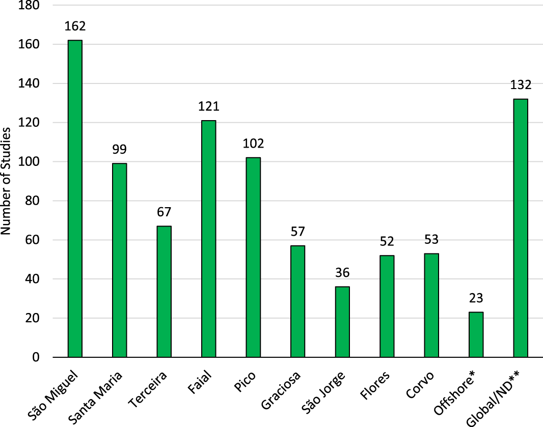 Quantitative representation of the included publications for each island of Azores’ archipelago. Offshore* corresponds to Azores’ offshore Islets, shallow seamounts and banks (Formigas Islet, Dom João de Castro Bank seamount and Princesa Alice seamount). Global/ND** corresponds to Global Azores or not determined.