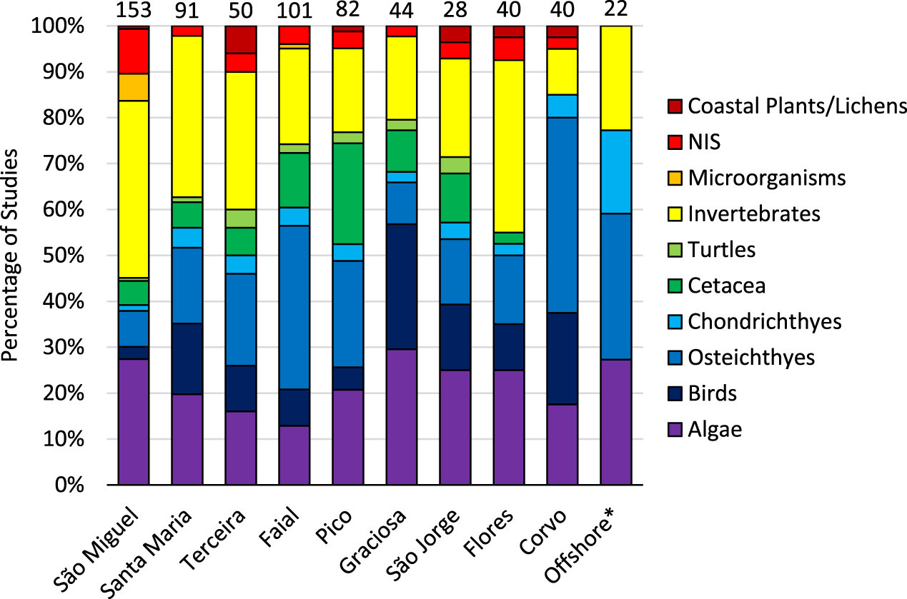 Proportion of groups/taxas of the included publications for each island of Azores’ archipelago. Offshore* corresponds to Azores’ offshore Islets, shallow seamounts and banks (Formigas Islet, Dom João de Castro Bank seamount and Princesa Alice seamount). The numbers above the bars correspond to the absolute value (N).