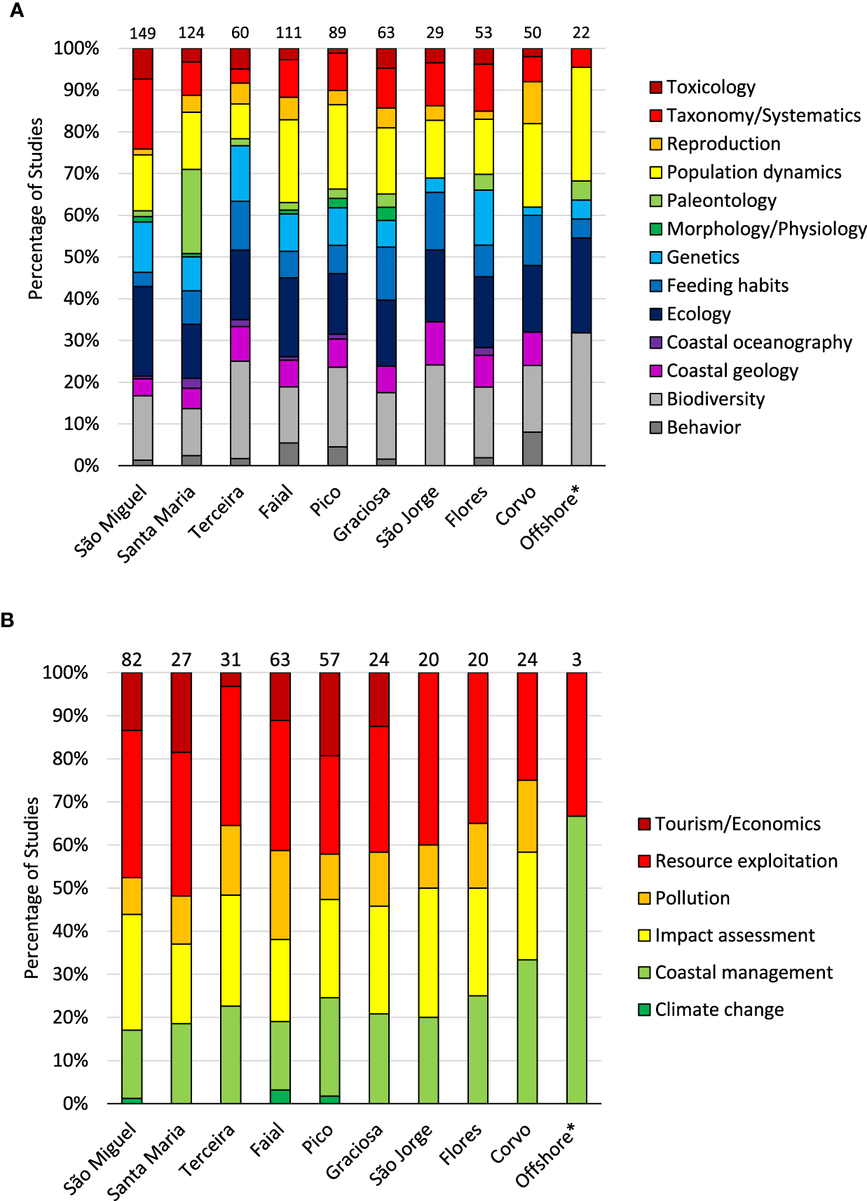 Proportion of disciplines among the included publications for each island of Azores’ archipelago, corresponding to: (A) Life and Earth Sciences and (B) Human uses, Impacts and Management. Offshore* corresponds to Azores’ offshore Islets, shallow seamounts and banks (Formigas Islet, Dom João de Castro Bank seamount and Princesa Alice seamount). The numbers above the bars correspond to the absolute value (N).