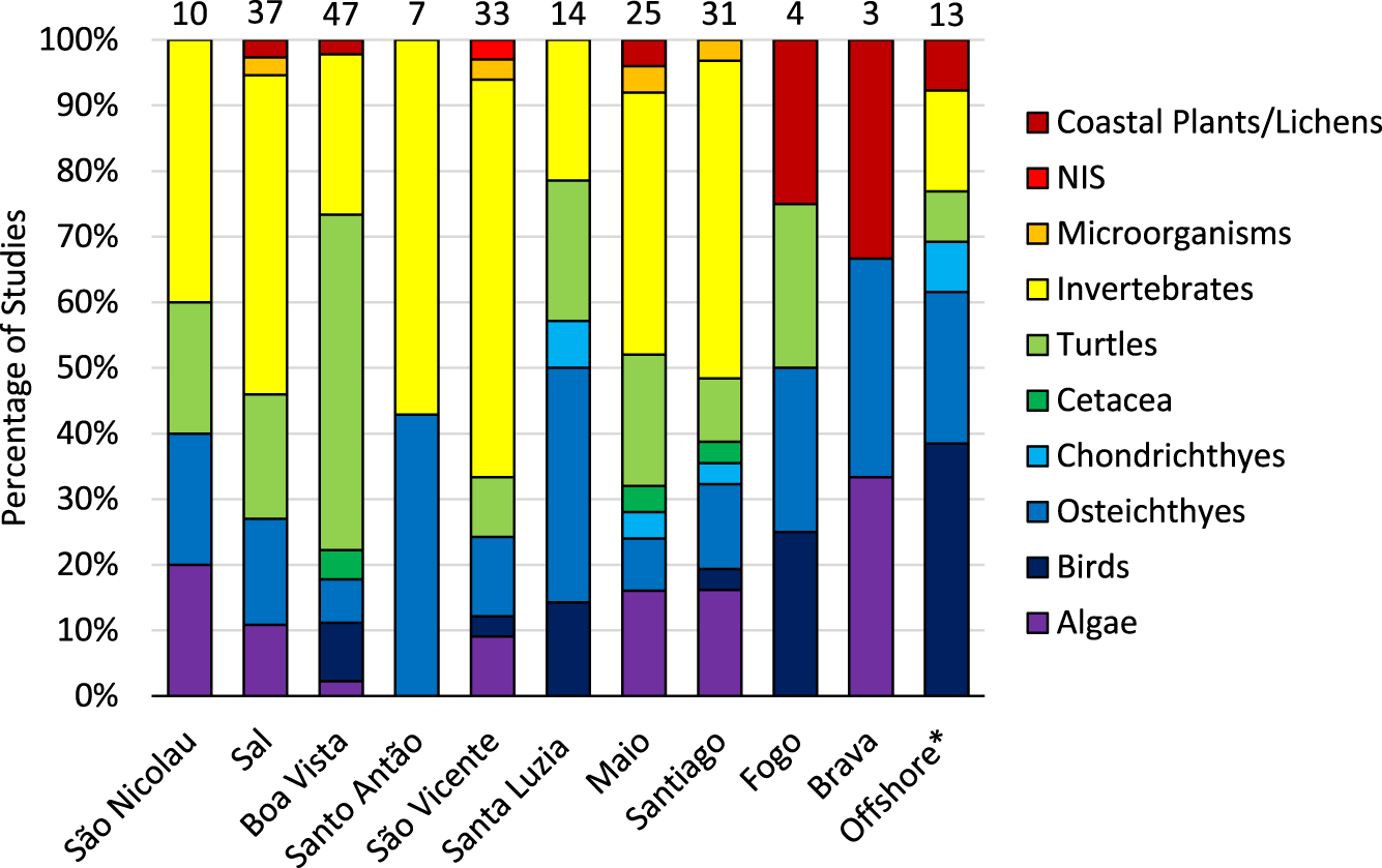 Proportion of groups/taxas of the included publications for each island of Cabo Verde’s archipelago. Offshore* corresponds to Cabo Verde’s offshore Islets, shallow seamounts and banks (Branco, Raso and Cima Islets, Senghor seamount, João Valente and Northwest Banks). The numbers above the bars correspond to the absolute value (N).