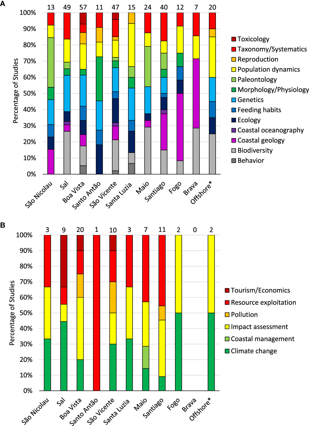 Proportion of disciplines among the included publications for each island of Cabo Verde’s archipelago, corresponding to: (A) Life and Earth Sciences and (B) Human uses, Impacts and Management. Offshore* corresponds to Cabo Verde’s offshore Islets, shallow seamounts and banks (Branco, Raso and Cima Islets, Senghor seamount, João Valente and Northwest Banks). The numbers above the bars correspond to the absolute value (N).