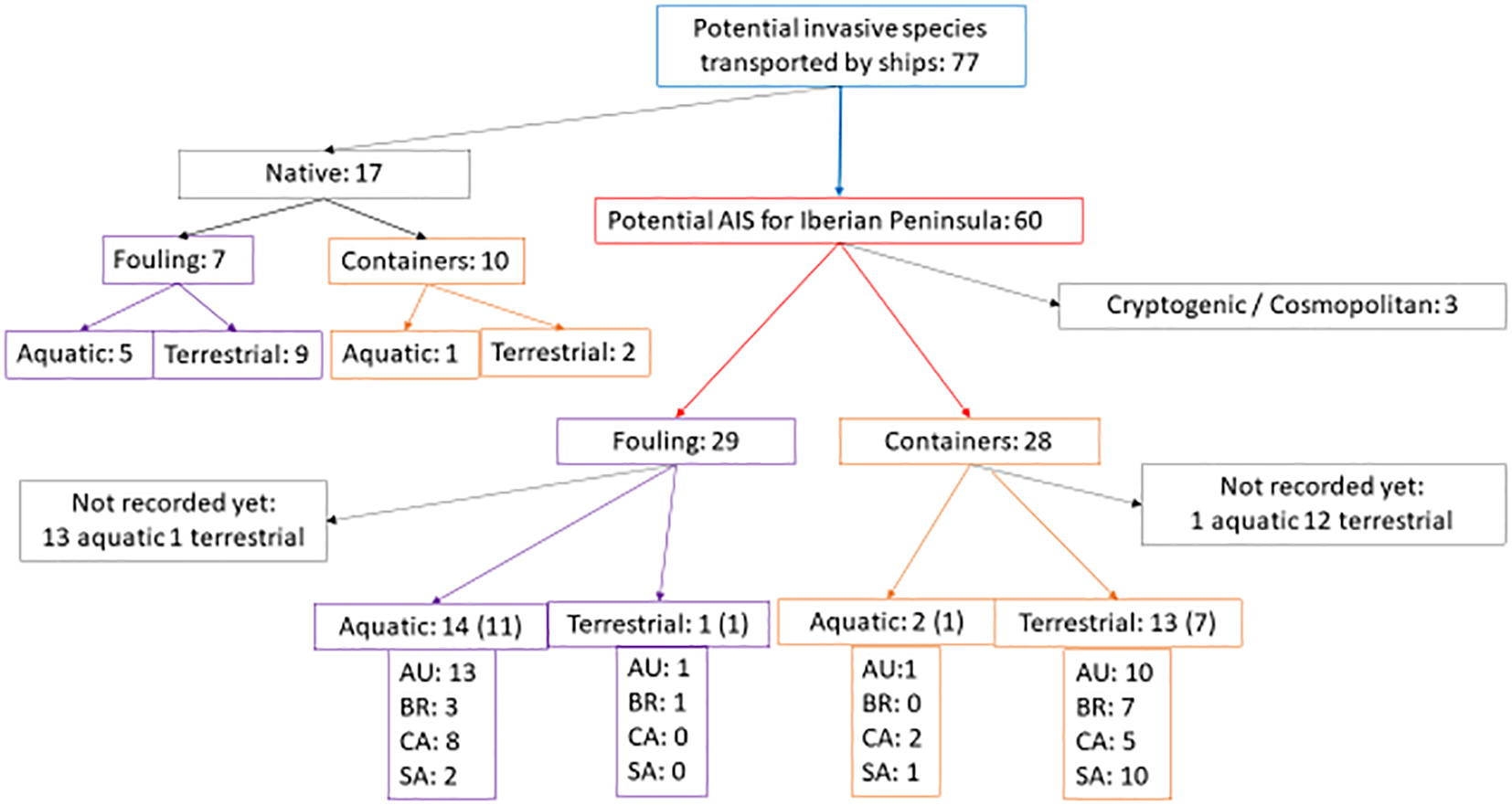 Flow diagram showing the number of invasive species found in the donor regions and in Spain that can be transported by ship fouling or dry containers. The number of species and type of habitat (aquatic or terrestrial) present at the same time in Spain and each donor port are indicated. AU, Australia; BR, Brazil; CA, Canada; SA, South Africa. The number of species reported from Asturias appears in parenthesis.