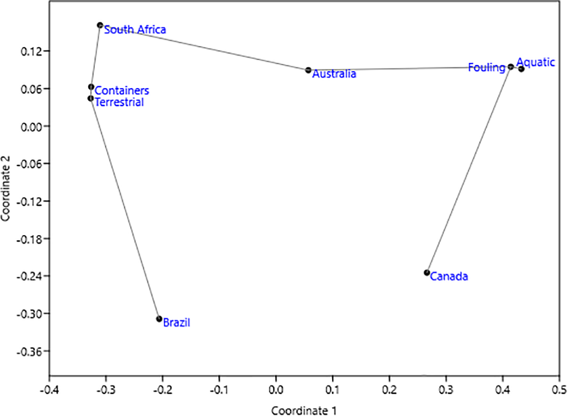 The nMDS of the donor country (Australia, Brazil, Canada, South Africa), introduction pathway, and AIS habitat (aquatic, terrestrial) for the 30 AIS had a moderate stress of 0.11 with r2 of axis 1 = 0.74 and axis 2 = 0.02. In the scatter plot (Figure 3), Canadian and Australian AIS were connected by the fouling pathway and aquatic habitat, while Brazil and South Africa were connected by the container pathway and terrestrial habitat. This indicates that AIS imported from South Africa and Brazil are mainly terrestrial and transported by containers, while those imported from Canada and Australia are aquatic fouling species.