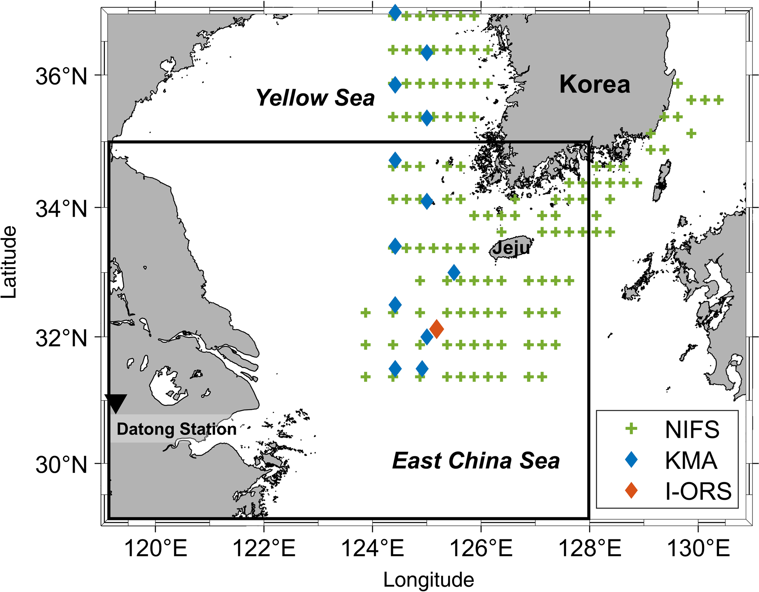 Study area and matching stations for the in-situ and satellite data from 2015 to 2021. The serial shipboard observation stations from National Institute of Fisheries Science (NIFS) are marked by a green cross sign. The blue and red diamonds indicate the CTD location of Korea Meteorological Administration (KMA), and Ieodo Ocean Research Station (I-ORS) used for the model validation. The black solid box is the region where the CDW volume is calculated in Section 3.