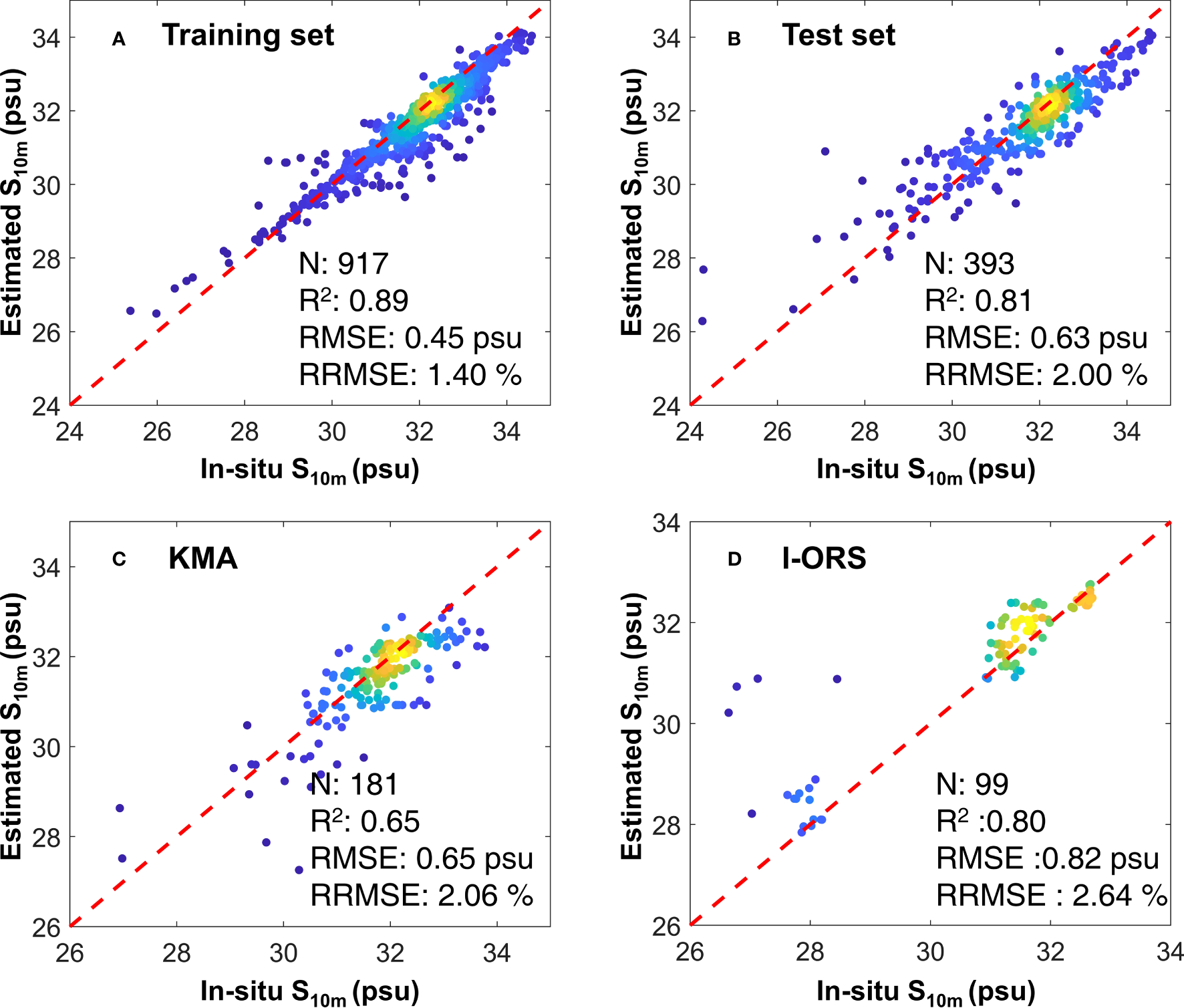 Density scatter plots between in-situ and estimated S10m derived from CNN. (A, B) are the results of training and test sets, respectively. (C, D) represent the results using KMA and I-ORS data, respectively.