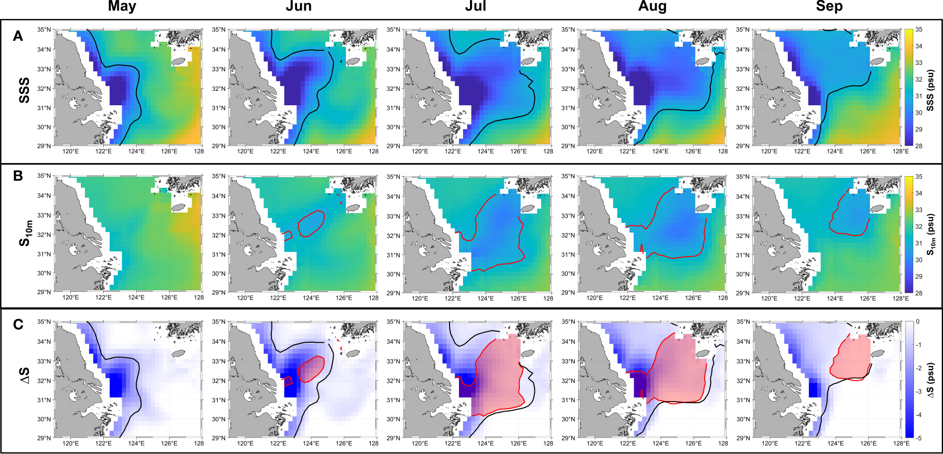The monthly spatial distributions (A) SMAP SSS (B) CNN result of S10m and (C) ΔS (SSS–S10m) from 2015 to 2021. The solid black lines and red lines represent the 31 psu isohalines at the surface and at a depth of 10 m, respectively. Red shading indicates location where CDW exists deeper than 10 m.