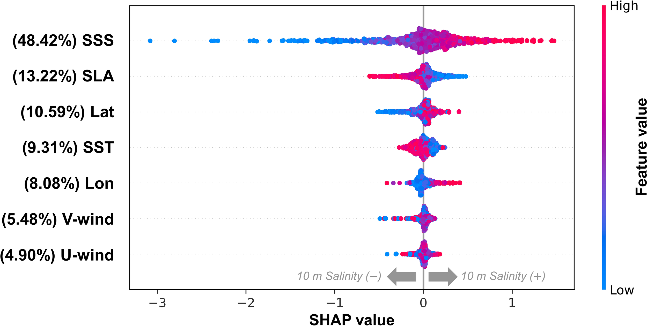 We selected physically related variables and geographic information as input factors to estimate the S10m as sea surface parameters. To investigate the importance of geographic information, we compared the results of the model trained with only physical factors with the model with geographic information included. The results showed that the model without geographic information had lower accuracy, with an R2, RMSE, and RRMSE of 0.79, 0.67 psu, and 2.13%, respectively, in the test set compared to the model with geographic information included. The SHAP analysis applied to this model revealed that the contribution of each variable was as follows: SSS (56.36%), SLA (17.07%), SST (12.67%), V-wind (7.48%), and U-wind (6.42%). When geographical information was excluded, the relative importance of other variables increased, but the order of variable importance remained the same (Figure 5). The geographical information represents the significance of the Changjiang River location in this study. The Changjiang River is a dominant source of freshwater in the ECS and is located southwest of our study area. As the latitude and longitude decrease (blue), it gets closer to the mouth of the Changjiang River, resulting in low S10m values. In addition, the results suggest that latitude has a more significant impact than longitude. The CDW from the Changjiang River tends to spread eastward and therefore exists over a relatively wide range of longitudes (Figure 4). Therefore, changes in latitude have a more significant effect on S10m changes than that in longitude. It allows us to recognize that physical and geographical factors both have a significant impact on model performance.