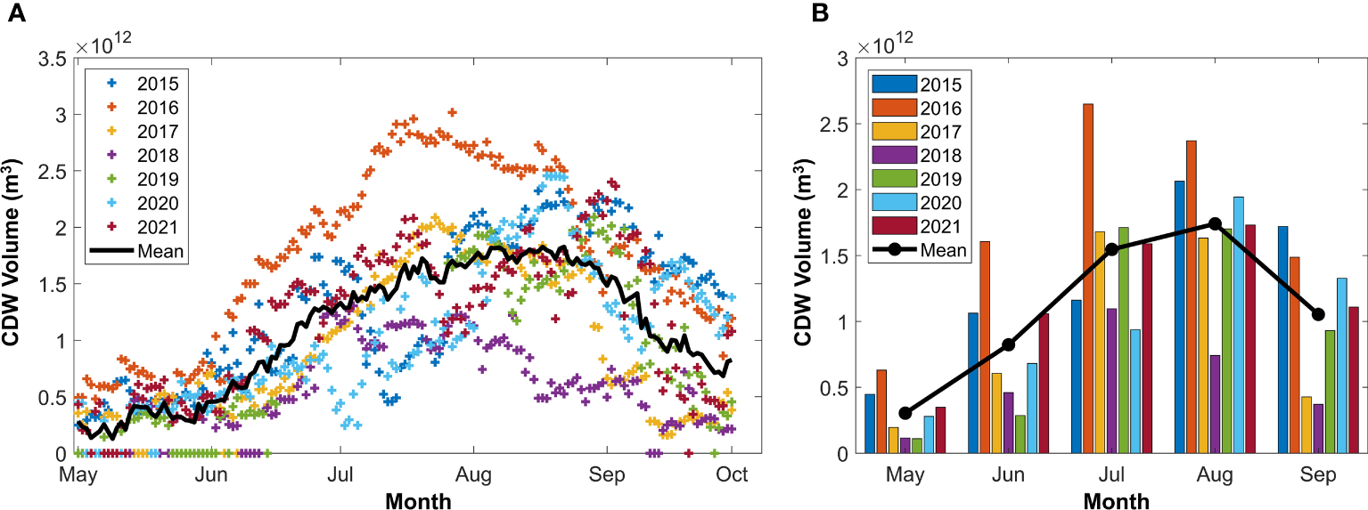We analyzed the relationship between the CDW volume and CRD, which is the main controlling factor for CDW (Figure 9) (Beardsley et al., 1985; Lie et al., 2003; Chen et al., 2008; Siswanto et al., 2008). In spring (May to early June), the CDW volume was close to zero and peaked in July as the CRD increased. It should be noted that there was a time lag of 34 ± 15 days between the CDW volume and CRD. This is consistent with previous studies demonstrating that the CDW extends eastward in June with increasing CRD and reaches Jeju Island after 1–2 months (Chen et al., 2008; Kim et al., 2009; Son and Choi, 2022). Moreover, the years with the maximum volume in July (2016, 2017, 2018, and 2019) had an average time lag of 24.3 days, while the years with the maximum volume in August (2015, 2020, and 2021) had a longer time lag of 46.3 days. It does seem to depend on different mechanisms affecting the movement of CDW, such as wind and ocean currents. Particularly in 2021, CRD appeared to be different from other years, and it seemed to be artificially adjusted. It can be occurred by the impact of the Three Gorge Dam.