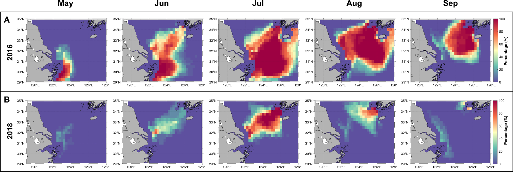 We investigated the spatial distribution of CDW volume at a depth of 10 m. Figure 7 shows the percentage of pixels included when calculating the volume of CDW that exists at depths of ≥ 10 m. The percentage represents the frequency of the pixels that were used to calculate the volume at 10 m each month. For example, pixels indicating 100% represent the presence of CDW at depths ≥ 10 m throughout the month in the corresponding locations. Figures 7A, B show the pixels for 2016 and 2018, which recorded the highest and lowest CDW volumes, respectively. In 2016, when the volume was more extensive, it was observed that CDW existed at depths > 10 m and gradually moved towards the Jeju coast over time. CDW in July spread extensively in the ECS throughout the month. In contrast, CDW in 2018 was located in a relatively narrow area. The spatial distribution of CDW at a depth of 10 m varied significantly depending on the volume.