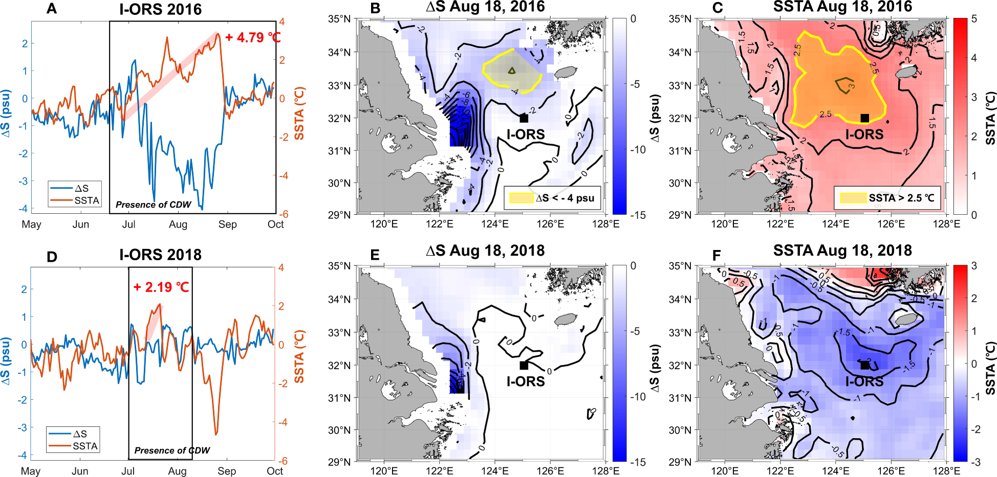 Time series of ΔS (SSS–S10m) and SSTA from I-ORS in (A) 2016 and (D) 2018, respectively. The black box represents the length of time CDW has existed. (B, C) are the spatial distribution of ΔS and SSTA on August 18, 2016, respectively, while (E, F) show the same for August 18, 2018.