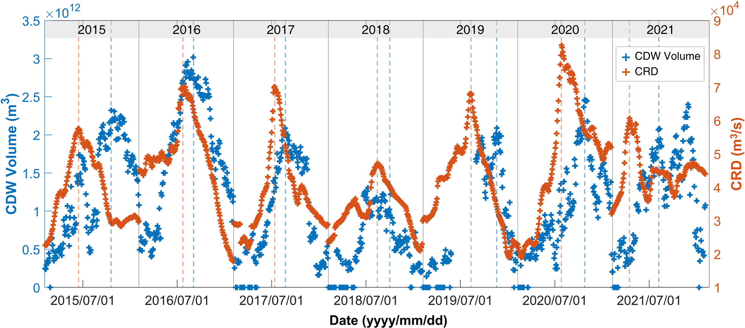 Time series of CDW volume and Changjiang River discharge (CRD) from 2015 to 2021. The blue dashed lines are peaks of CDW volume, and the orange dashed lines are peaks of CRD.