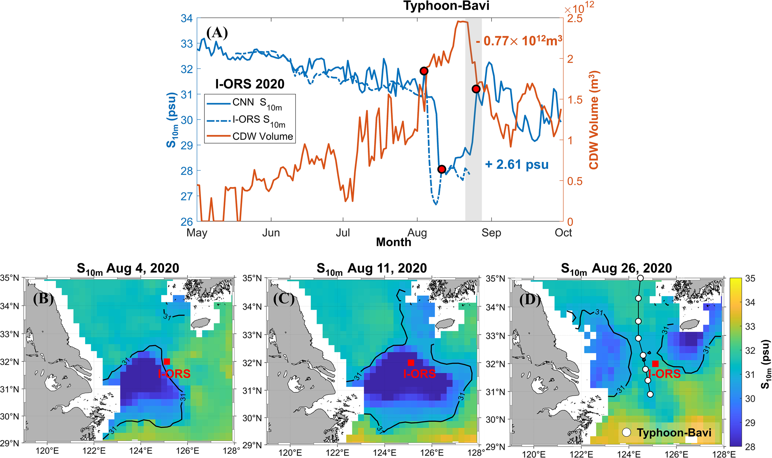 In addition to physical surface parameters used as input data, there are other environmental factors that can influence the volume of CDW. The primary factors responsible for decreasing the salinity of seawater are river inflows and precipitation. In particular, the ECS is highly affected by the Changjiang River, monsoon systems, and typhoons in the summer (Beardsley et al., 1985; Chen et al., 1994; Chang and Isobe, 2003; Lie et al., 2003; Kim et al., 2009; Son et al., 2020; Hong et al., 2022; Jung et al., 2022). Therefore, we addressed the CDW volume changes due to the influence of CRD and precipitation, which directly increases the freshwater in the ocean. Furthermore, we analyzed the impact of Typhoon Bavi (occurred in 2020).